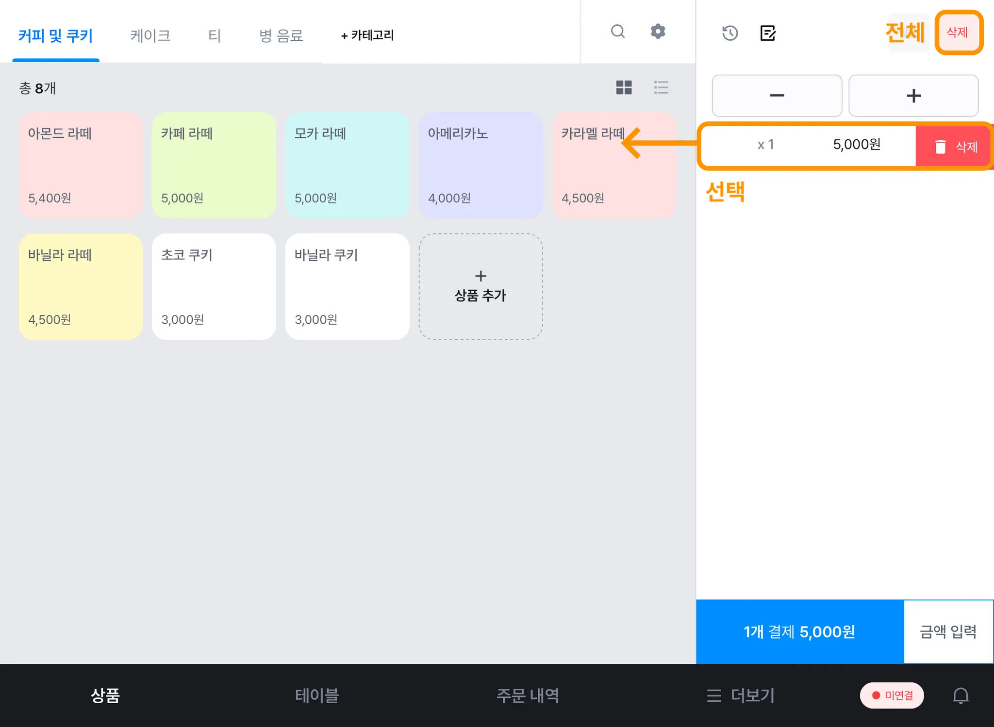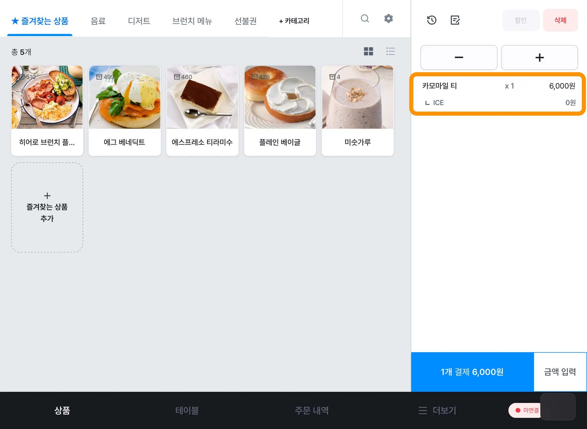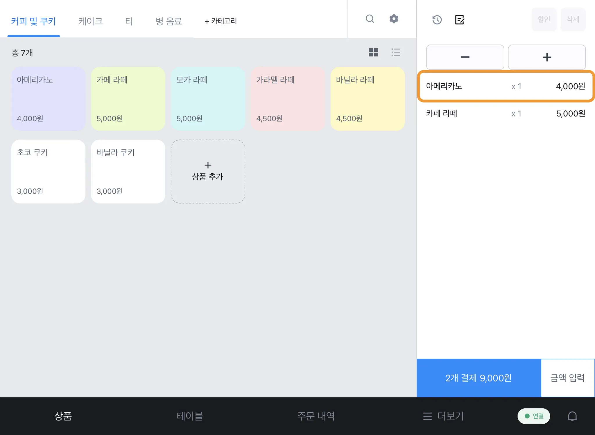 1) [상품] 탭에서 주문을 추가하고 오른쪽 상단 [