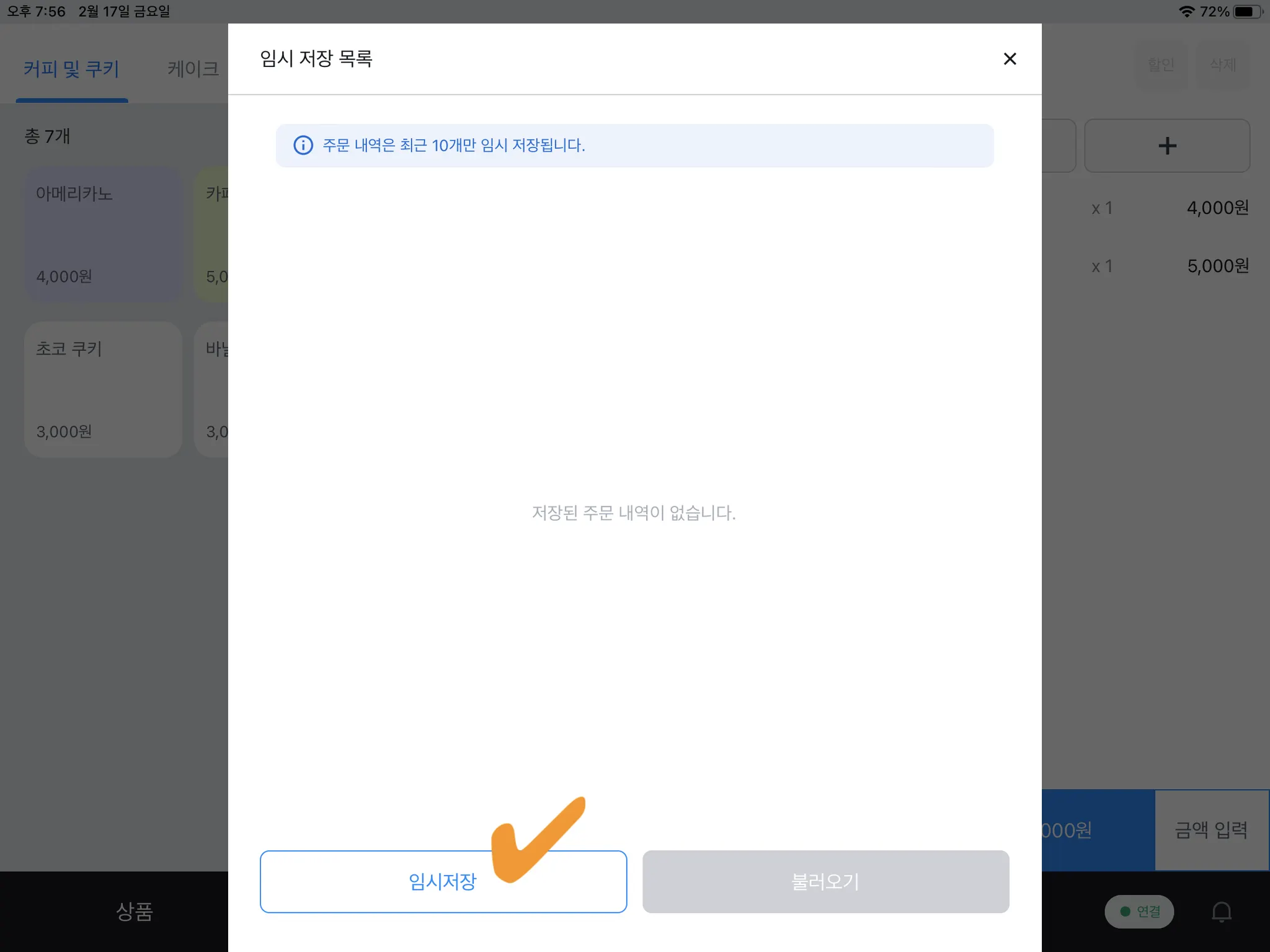 주문 내역은 최대 10개까지 임시저장할 수 있고, 영업을 마감하면 모두 삭제됩니다.