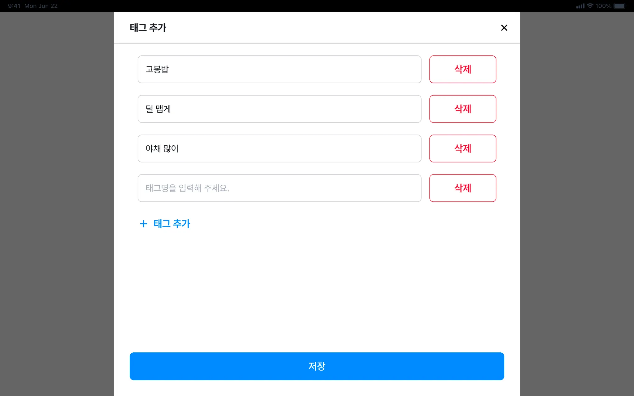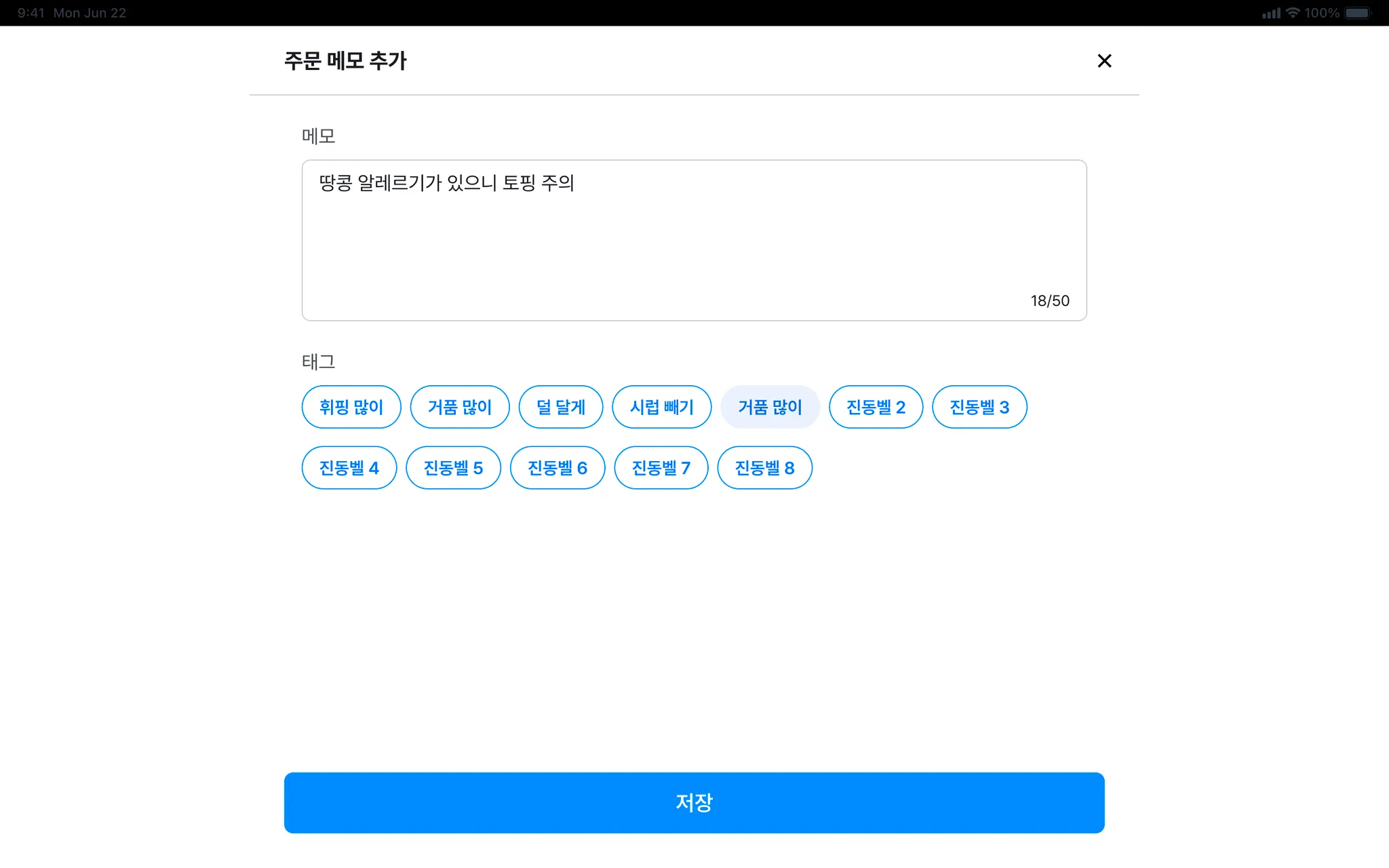 주문 태그는 15개까지 추가할 수 있습니다. (태그 당 10글자)