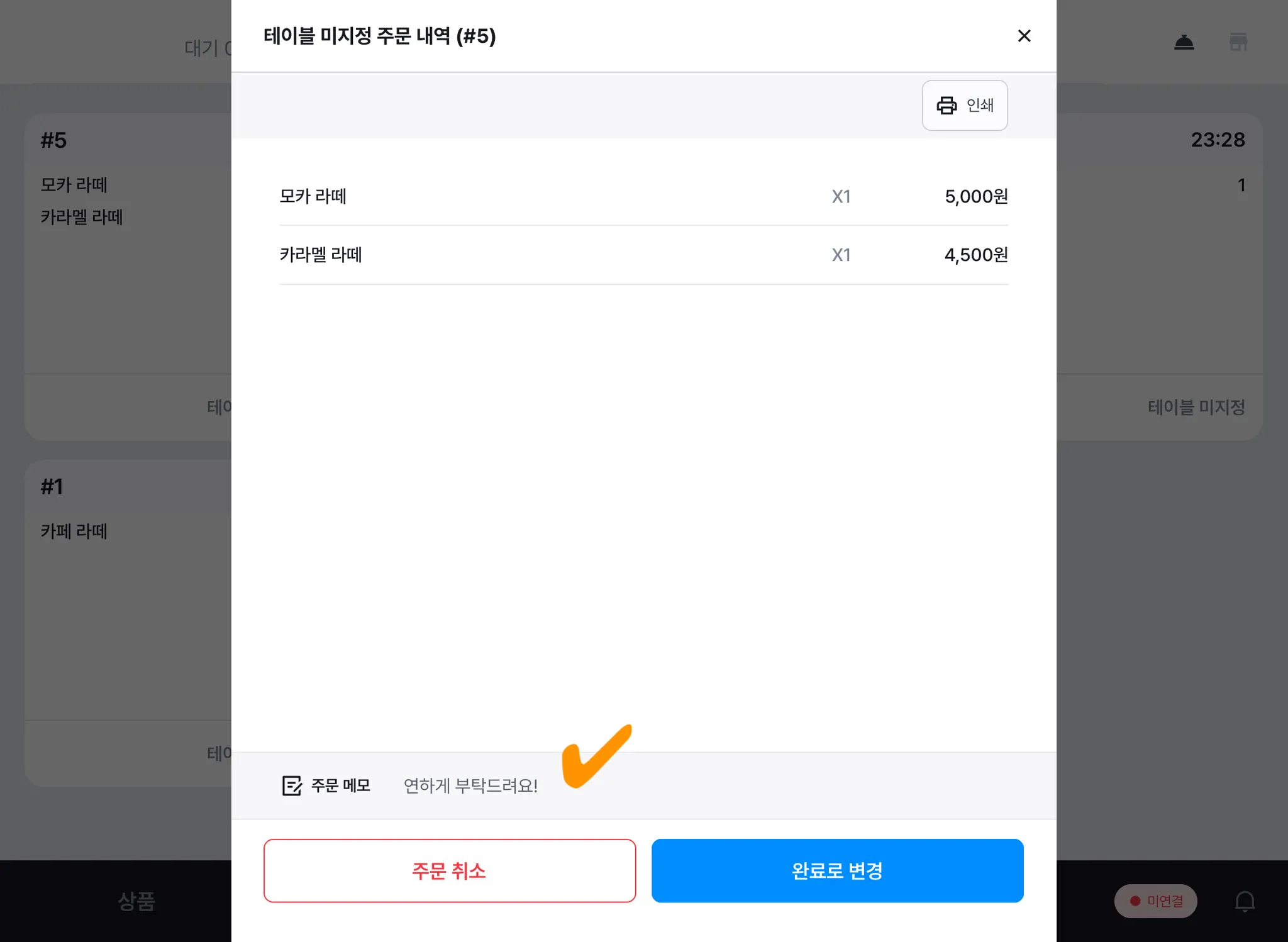 카페/음식점 판매자 유형의 경우, 주문 시 메모를 추가하여 주문서를 인쇄할 수 있습니다.