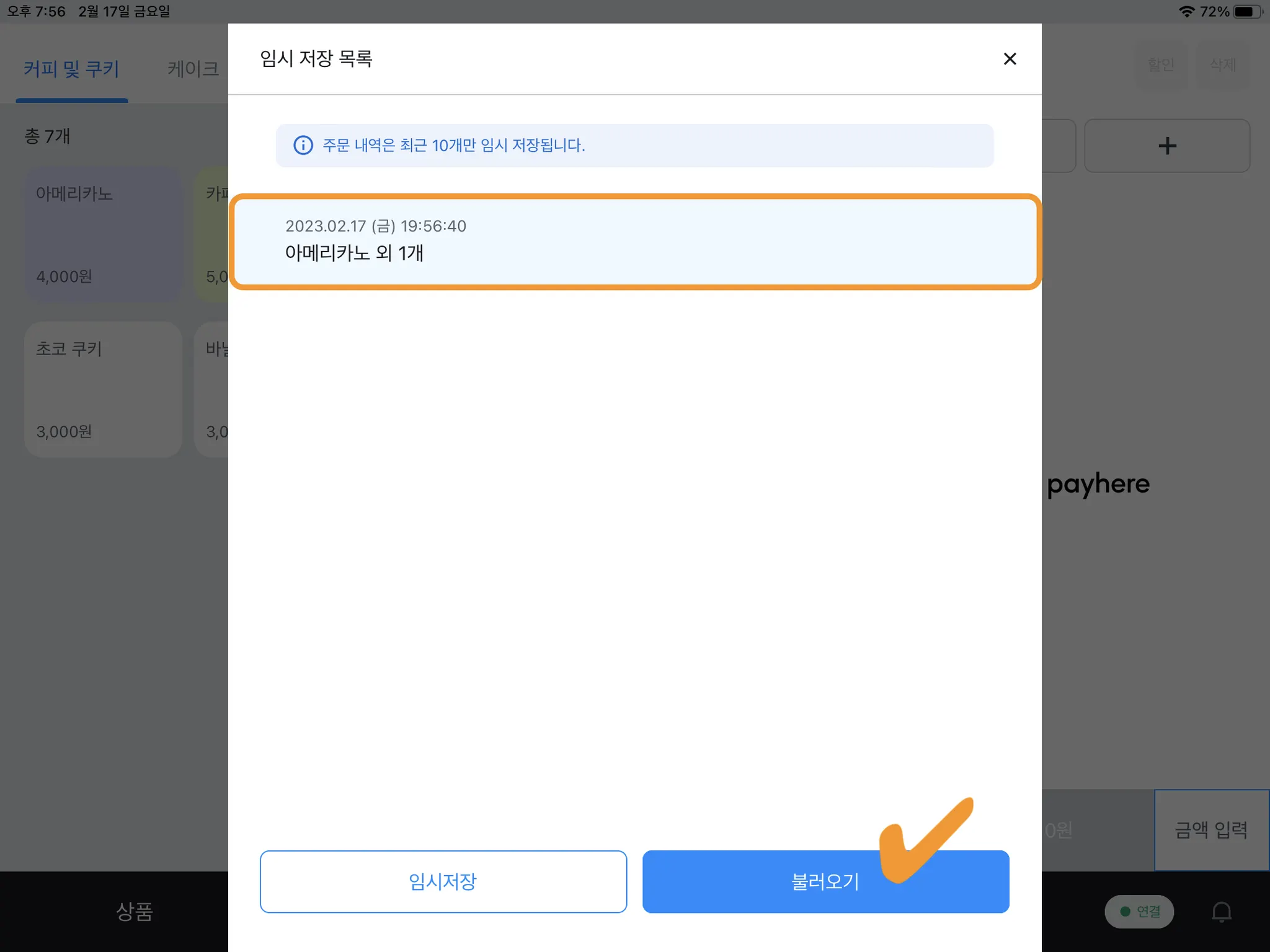 주문 내역을 임시 저장하고 추후 다시 불러와 결제할 수 있습니다.