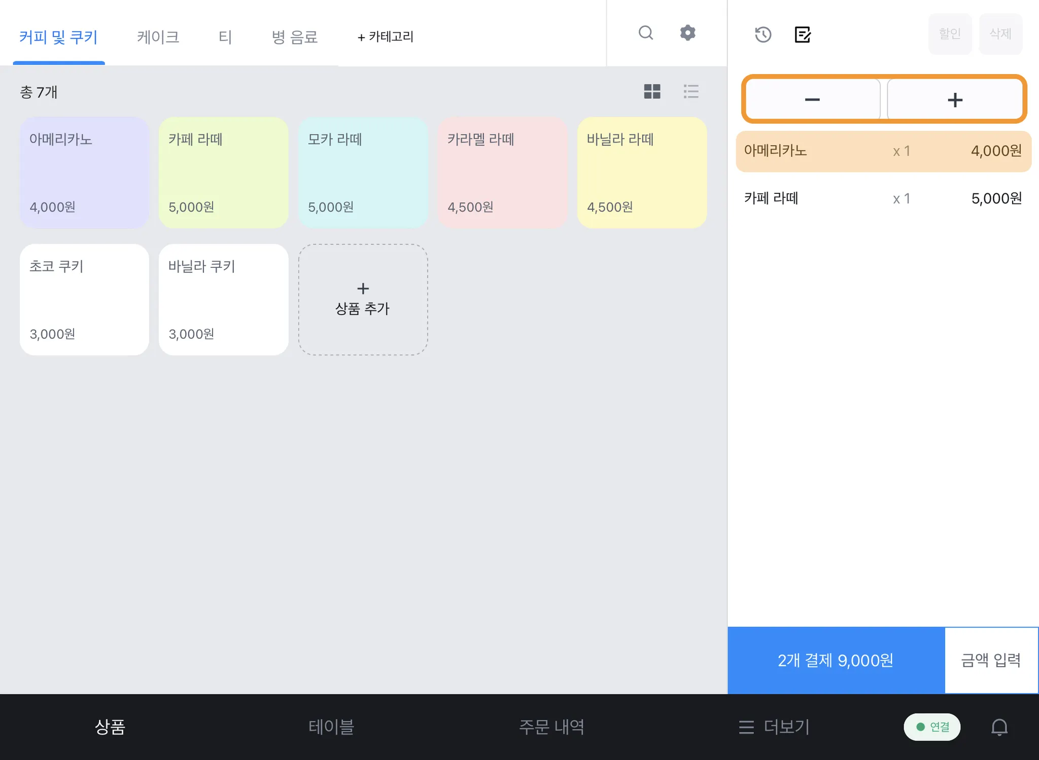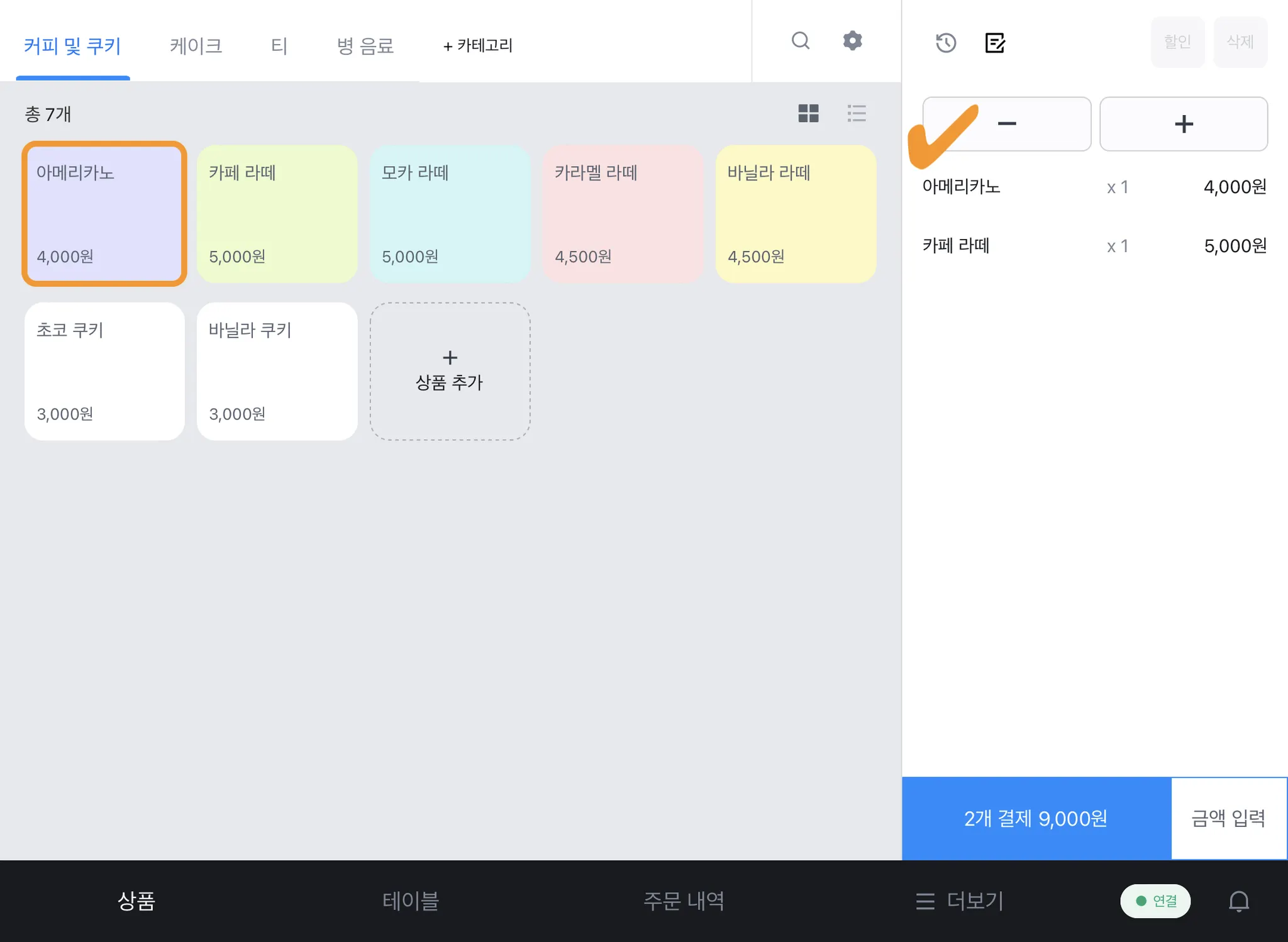 1) 원하는 상품을 누르고 위에 있는 [-/+] 버튼을 사용해 수량을 변경합니다.