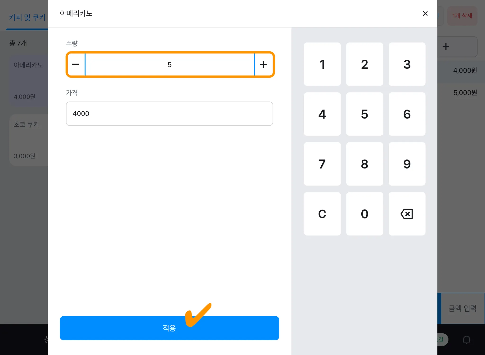 3) [-/+] 버튼을 누르거나 오른쪽의 숫자 키패드를 이용해 수량을 입력하고, [적용] 버튼을 누르면 옵션을 포함해 수량이 한 번에 변경됩니다.