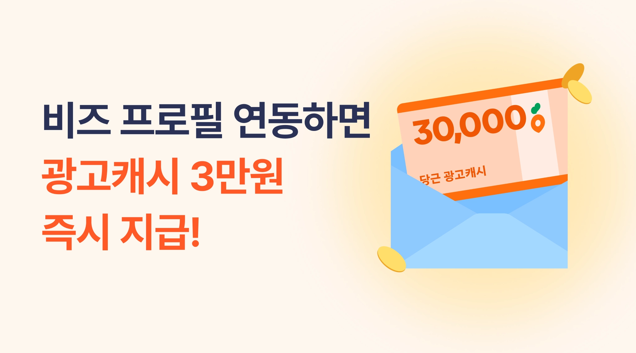 당근 비즈프로필을 연동하여 매장 마케팅 효과를 높이고 당근 광고캐시 3만 원을 즉시 받는 이벤트예요.