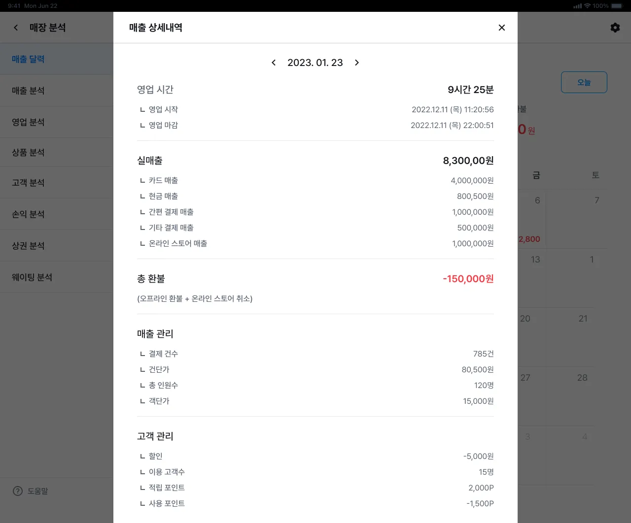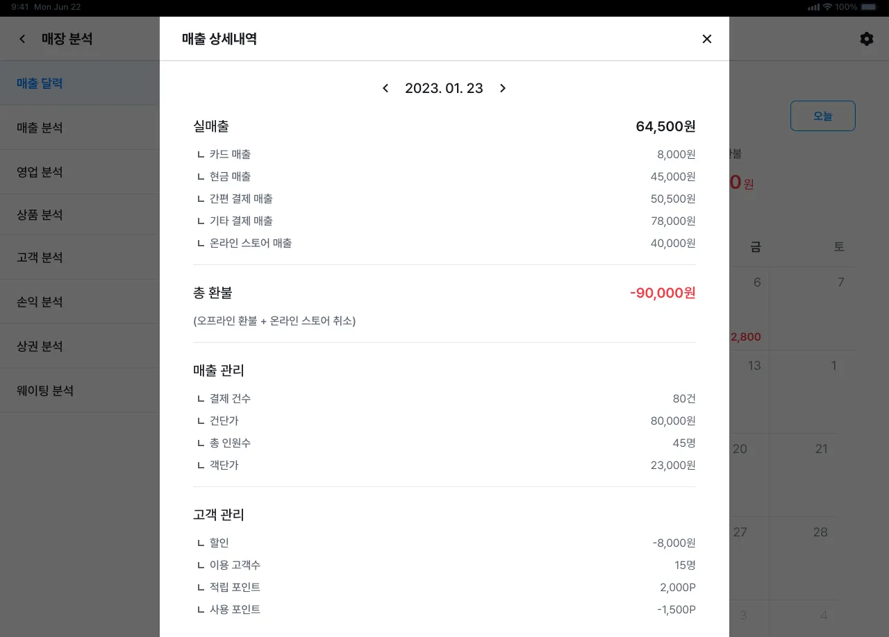 캘린더를 누르면 해당 날짜의 실매출과 총 환불, 매출 관리, 고객 관리를 확인할 수 있습니다.