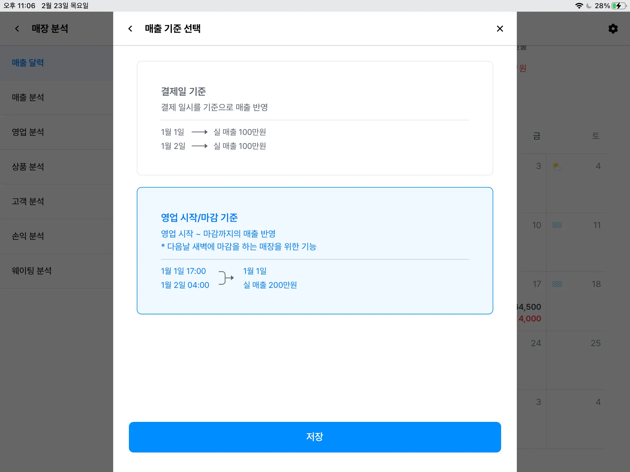 3) 매출 상세 내역에서 영업 시작/마감 일자를 볼 수 있습니다.
