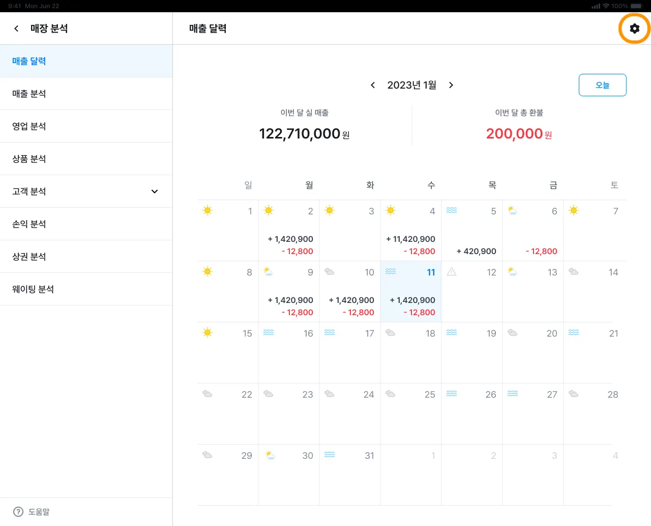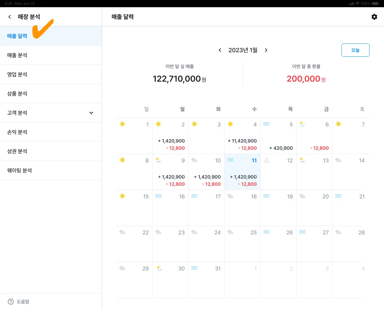2) 매출 달력 항목에서 일일 매출 금액과 환불 금액, 과거 날씨를 달력 형태로 확인할 수 있습니다.