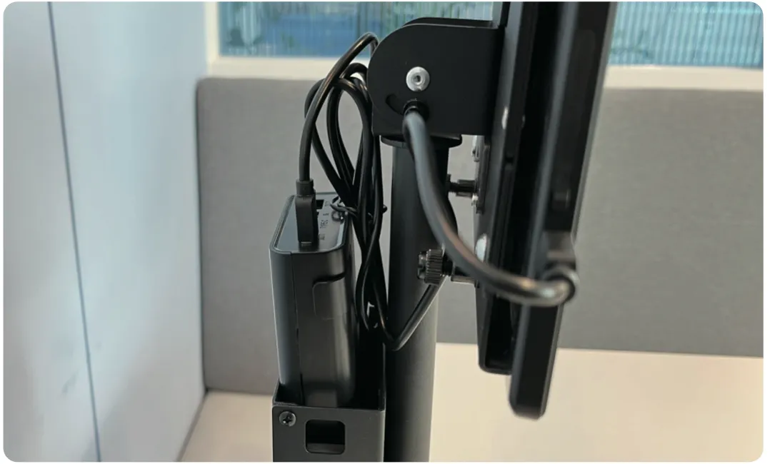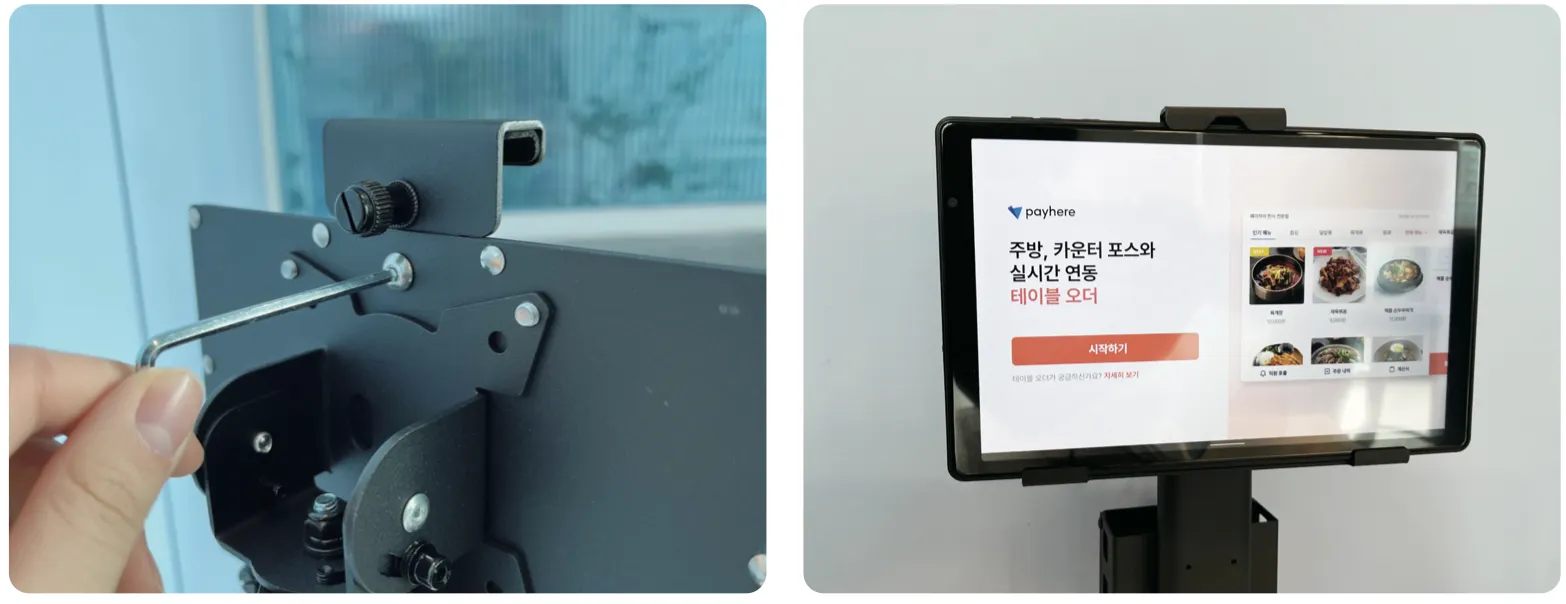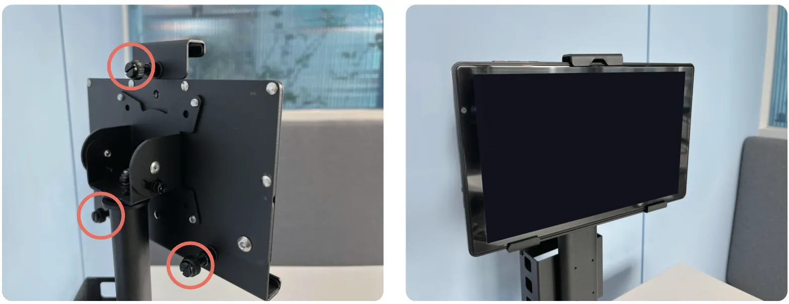 3) 거치대 뒷면 검은색 나사 3개를 풀어준 후 앞쪽에 태블릿을 거치해 주세요.