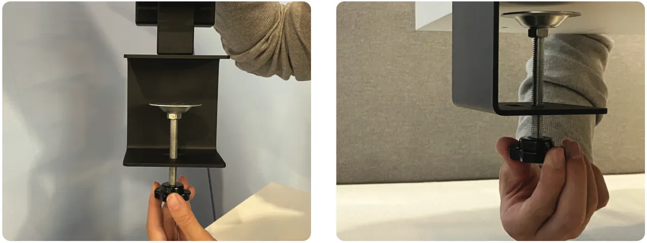 1) 거치대 하단의 고정 클램프를 돌려 테이블의 원하는 위치에 단단히 고정해 주세요.