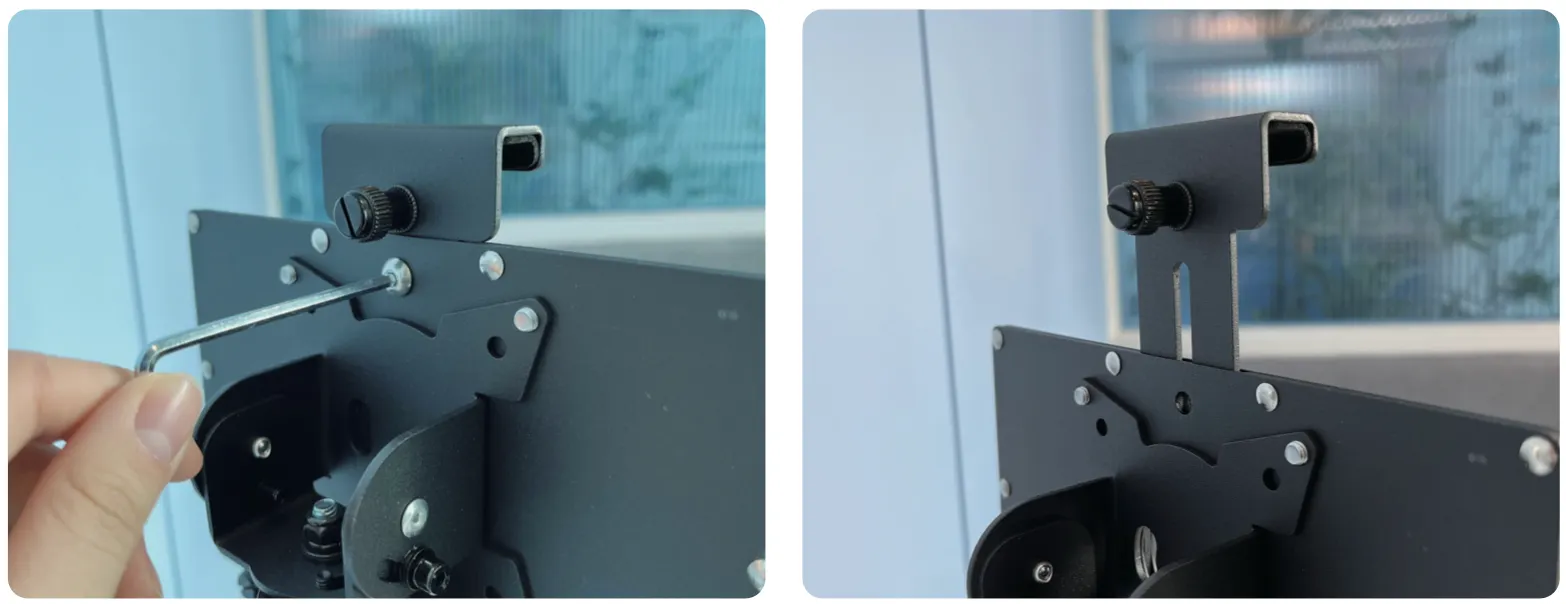 2) 거치대 뒷면 위쪽의 나사를 동봉된 육각 드라이버로 풀어준 다음, 태블릿 크기에 맞춰 위쪽을 조절해 주세요.