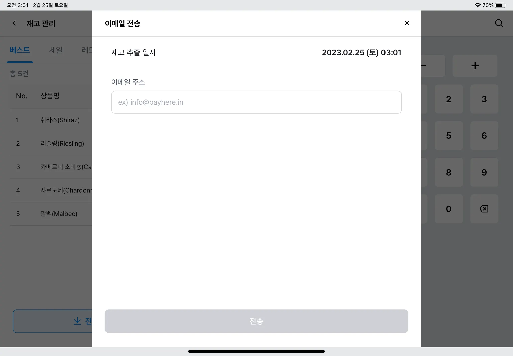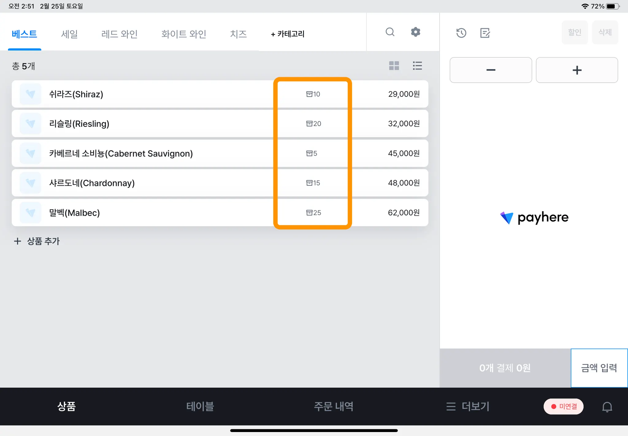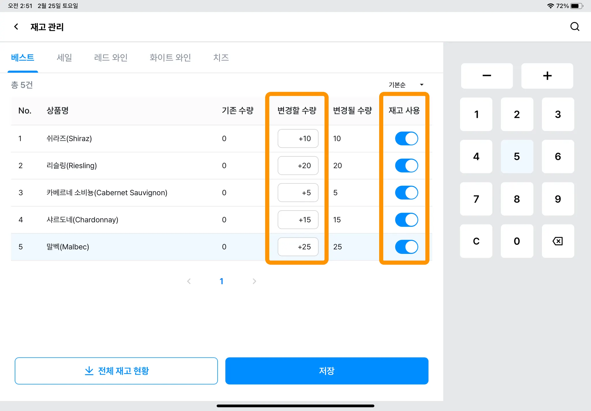 오른쪽 키패드를 이용해 수량을 입력하고 [저장]을 눌러주세요.