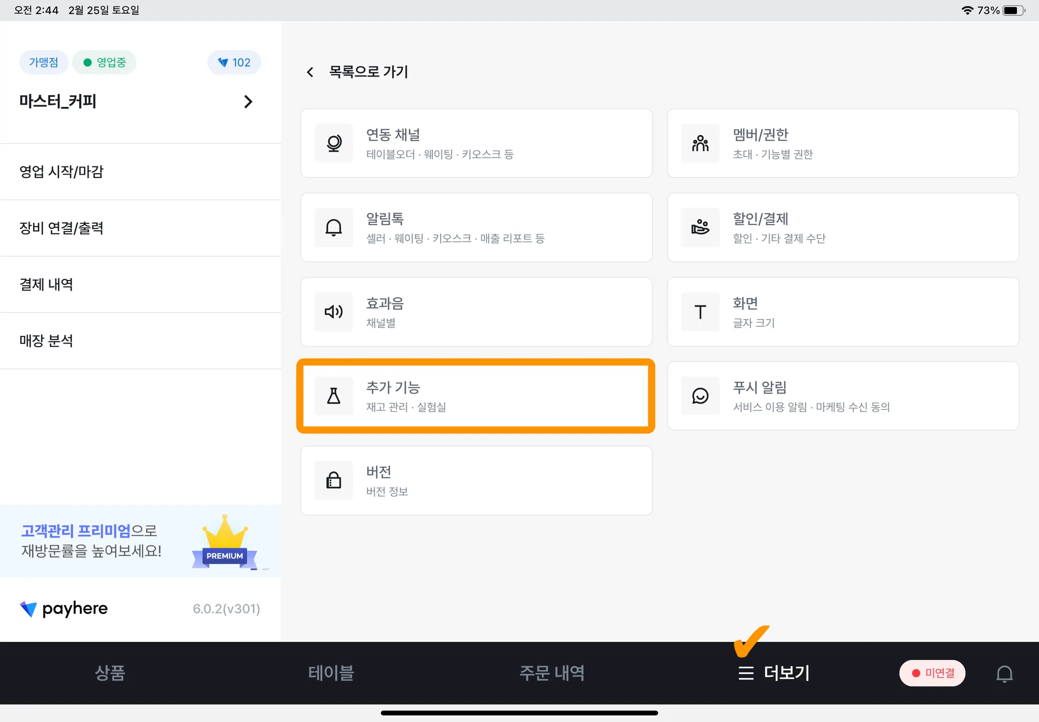 1) [☰ 더보기] → [추가 기능] 버튼을 눌러주세요.