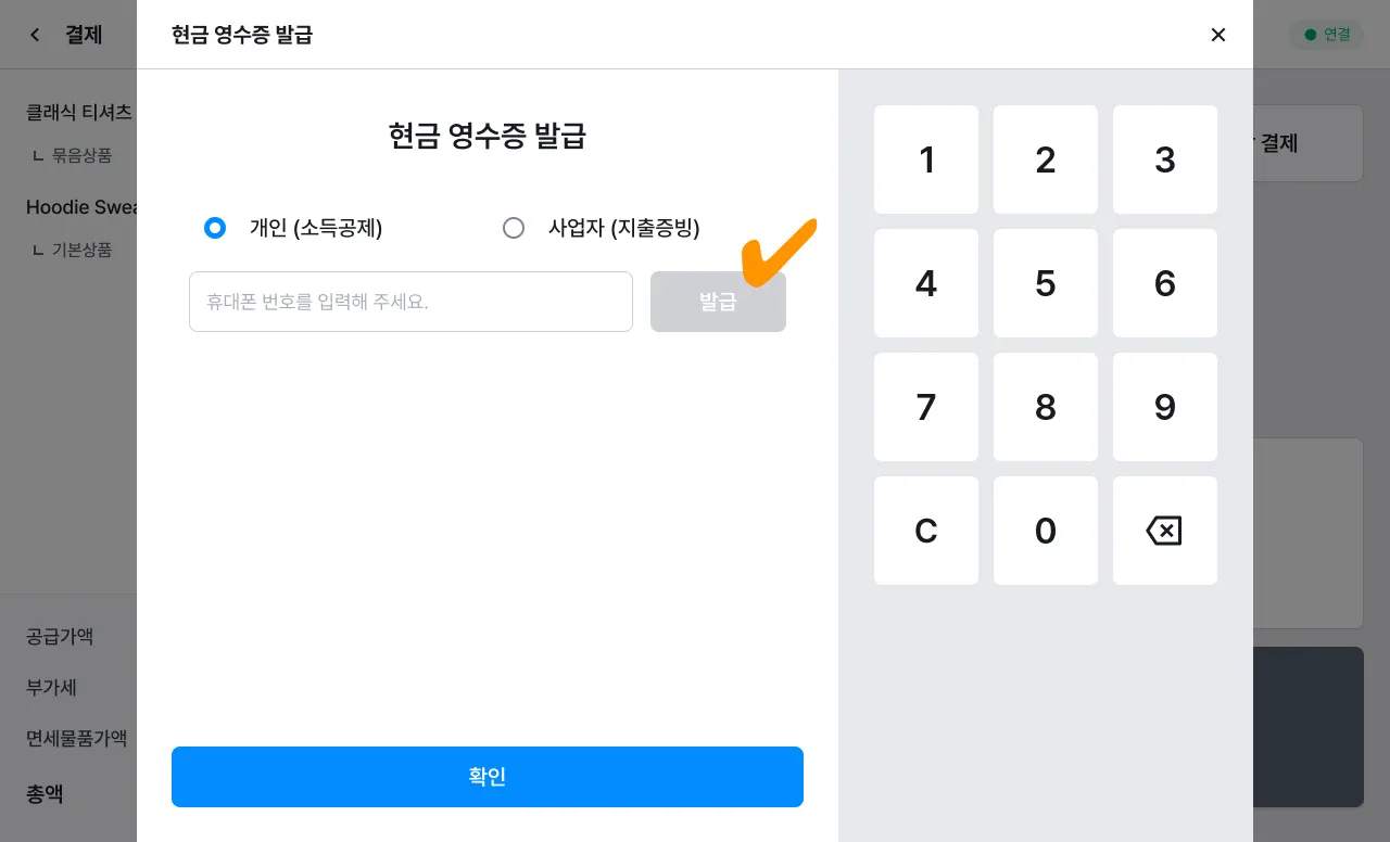 3) 원하는 수단(개인/사업자)을 선택하고 번호를 입력한 후 [발급] 버튼을 눌러주세요.