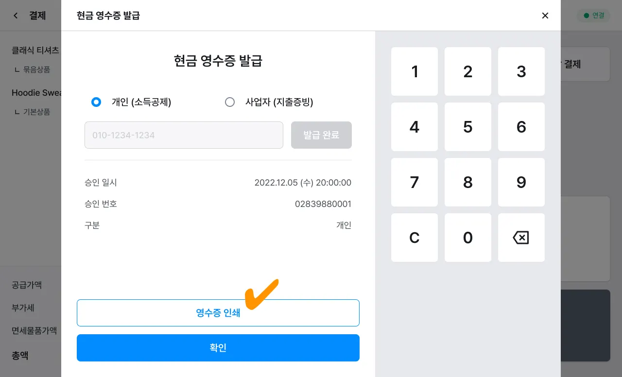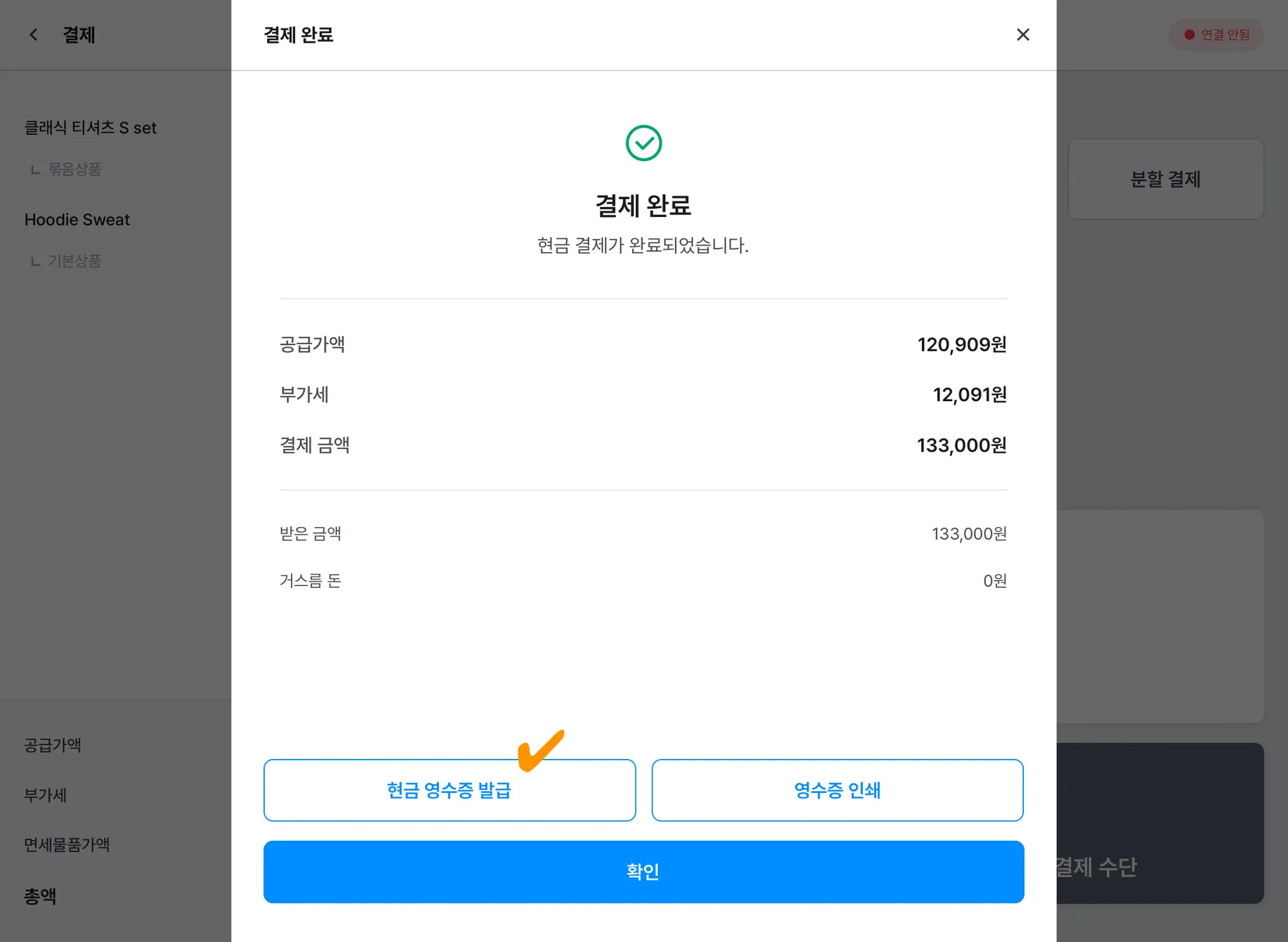 1) 현금영수증 발행은 결제를 완료한 후 진행할 수 있습니다. 일단 현금 결제를 진행해주세요.
