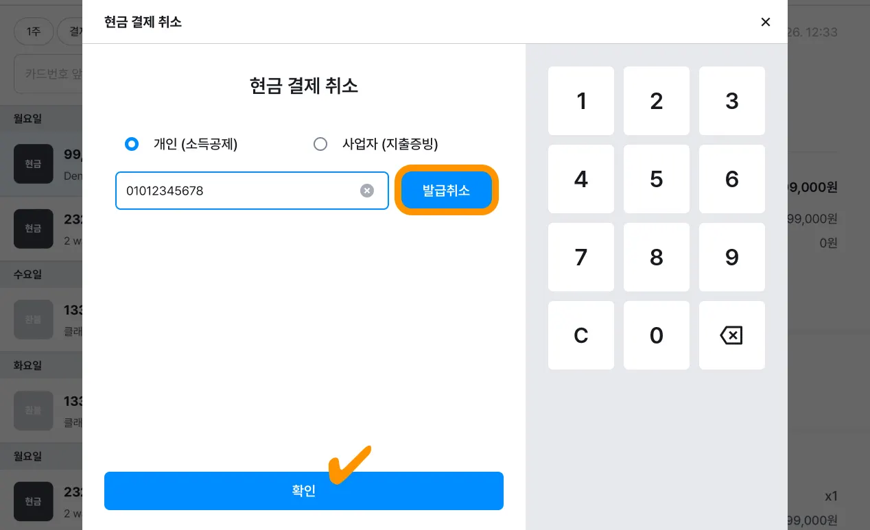 번호를 입력한 후 [발급 취소] 버튼을 누르면 현금영수증 발급이 취소됩니다.