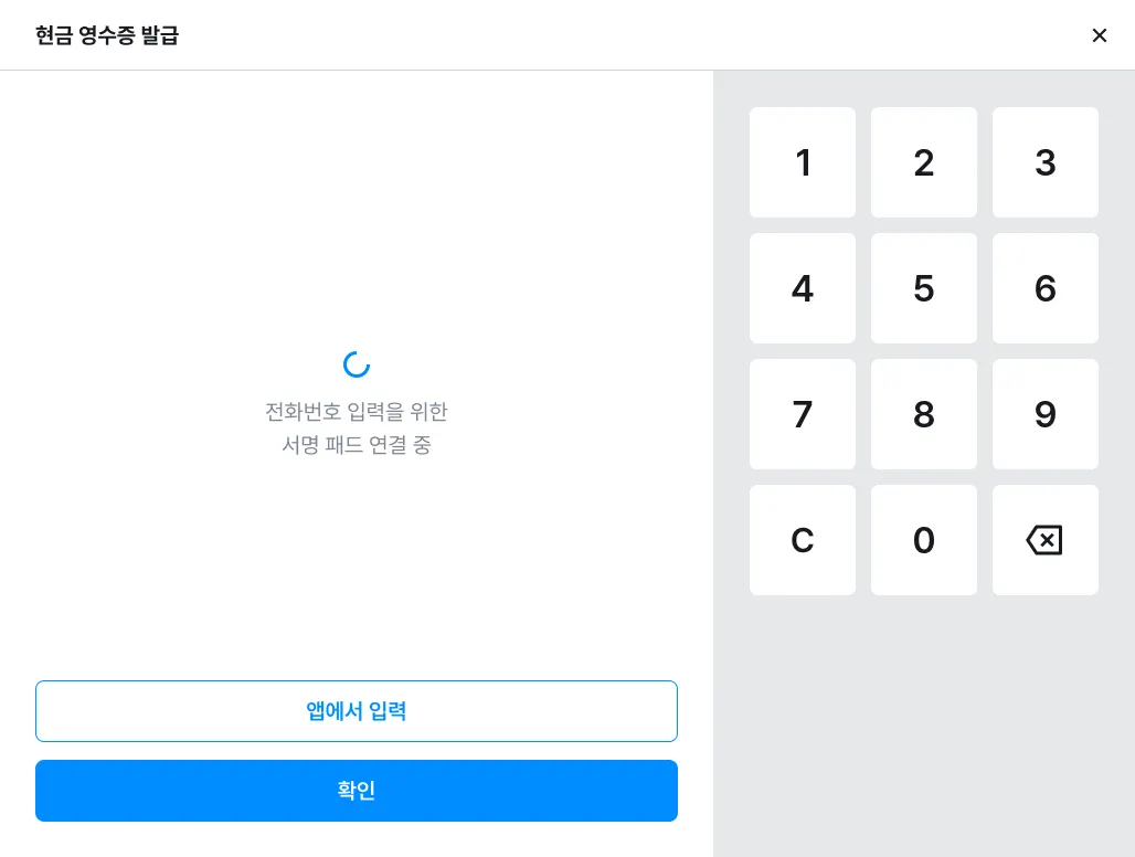 유선 카드 단말기 서명패드를 사용하면, 고객이 직접 전화번호를 입력할 수 있습니다(모바일에서만 가능).