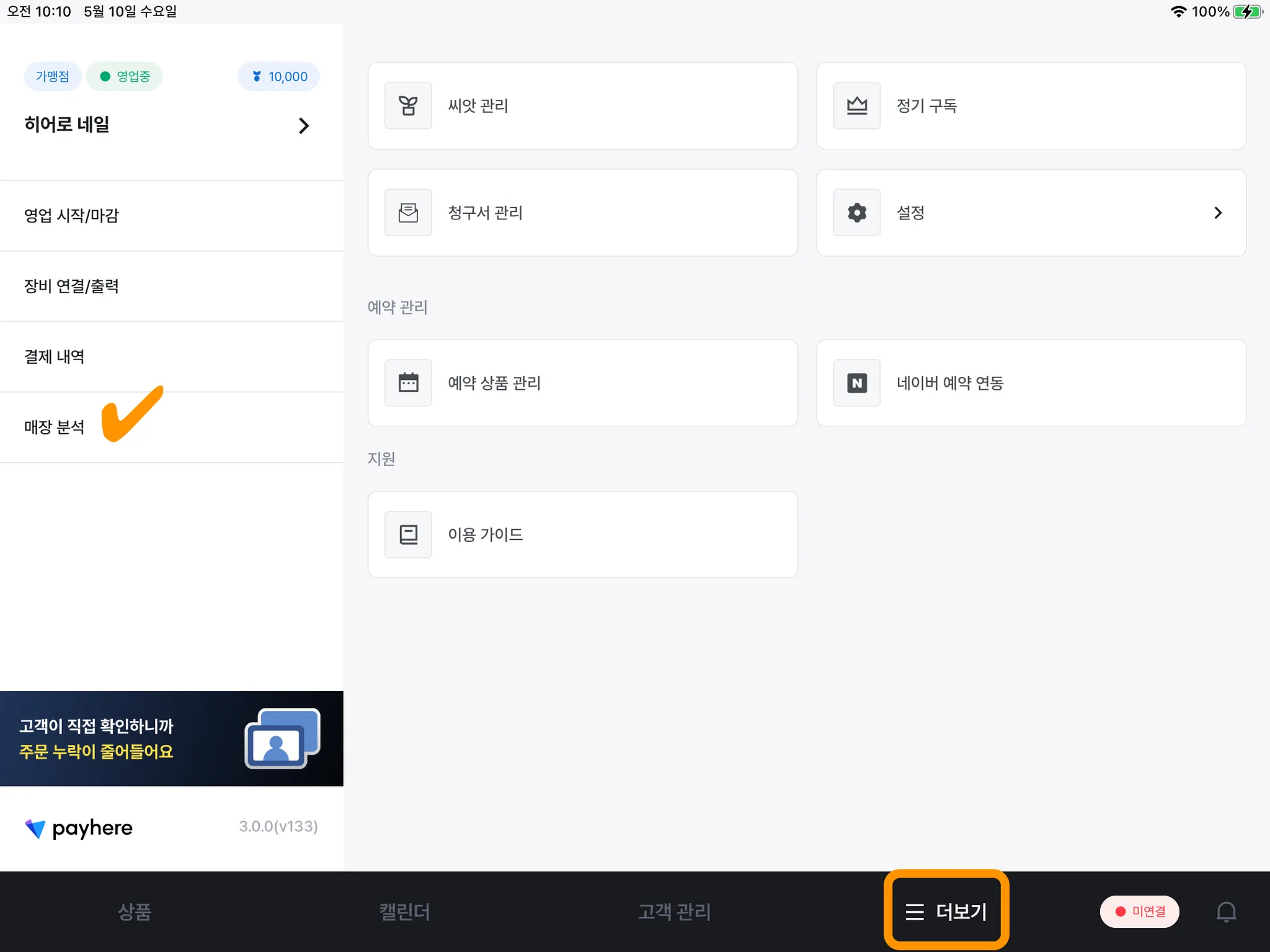 1) 오른쪽 하단의 [☰ 더보기] 버튼을 누르고, 매장 분석을 눌러주세요.