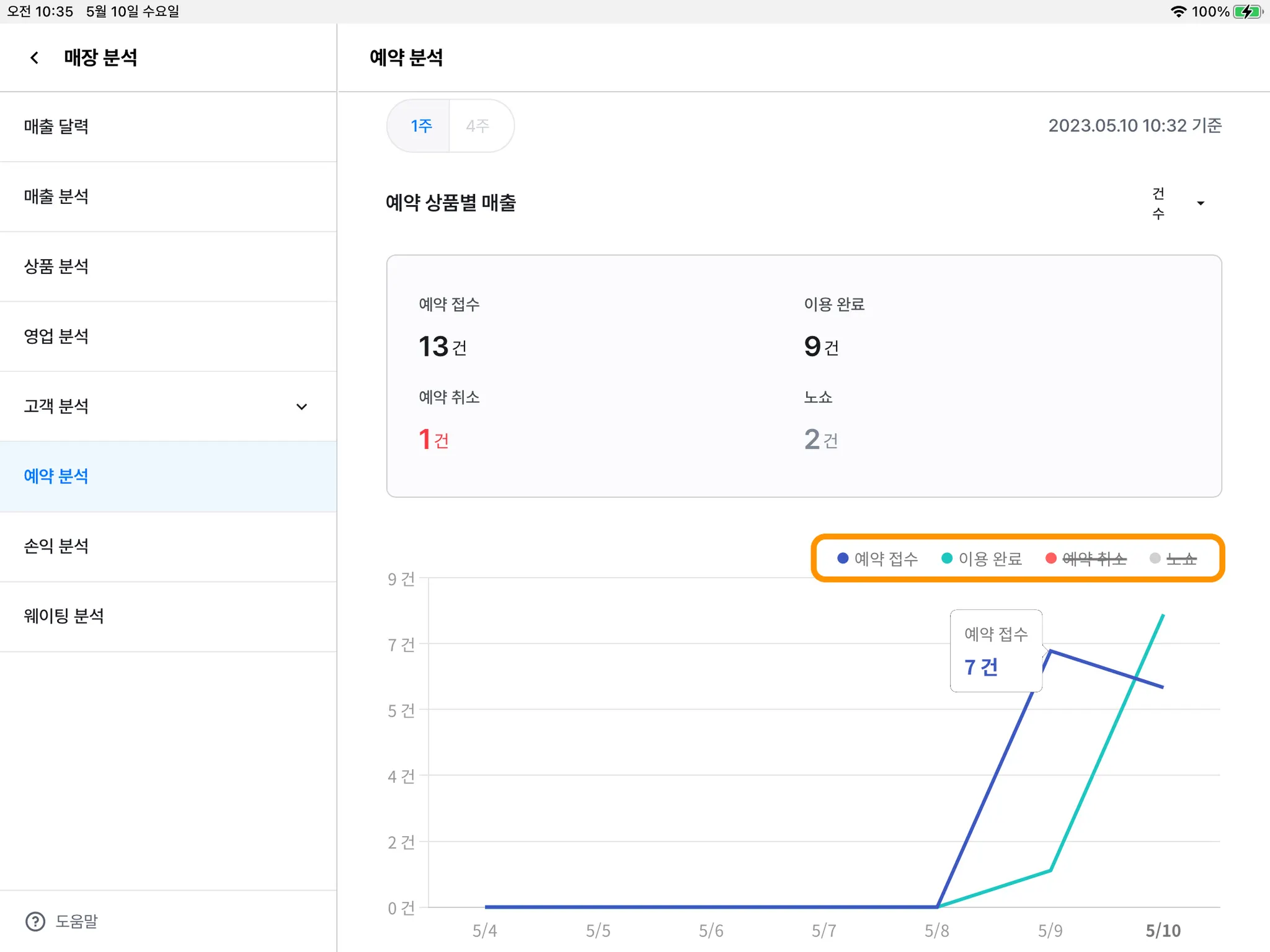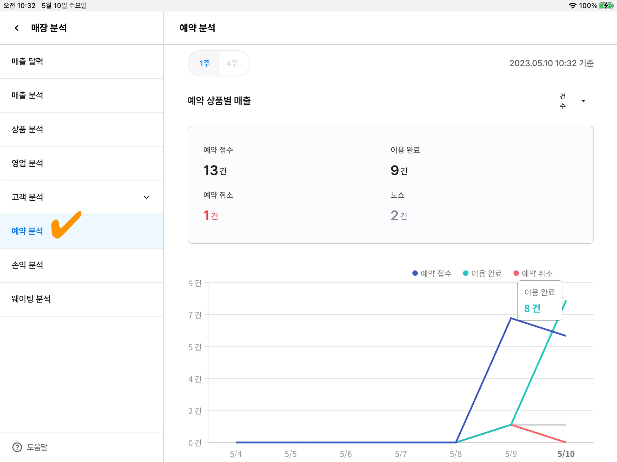 2) [예약 분석] 메뉴를 누르면 기간별 예약 현황을 파악할 수 있습니다.