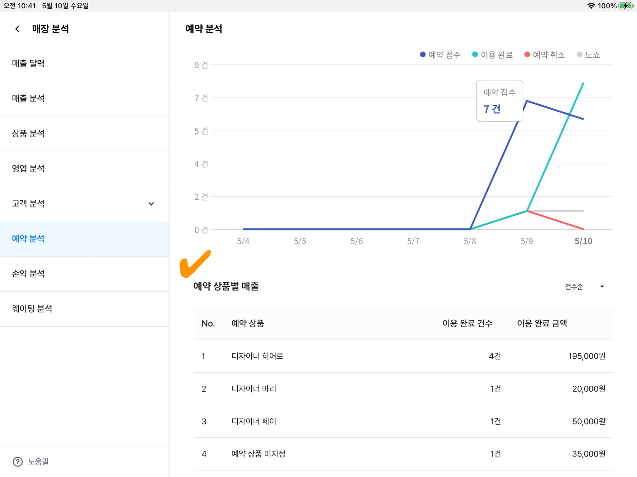 3) 예약 상품별 매출(디자이너 별 매출) 또한 확인할 수 있습니다.