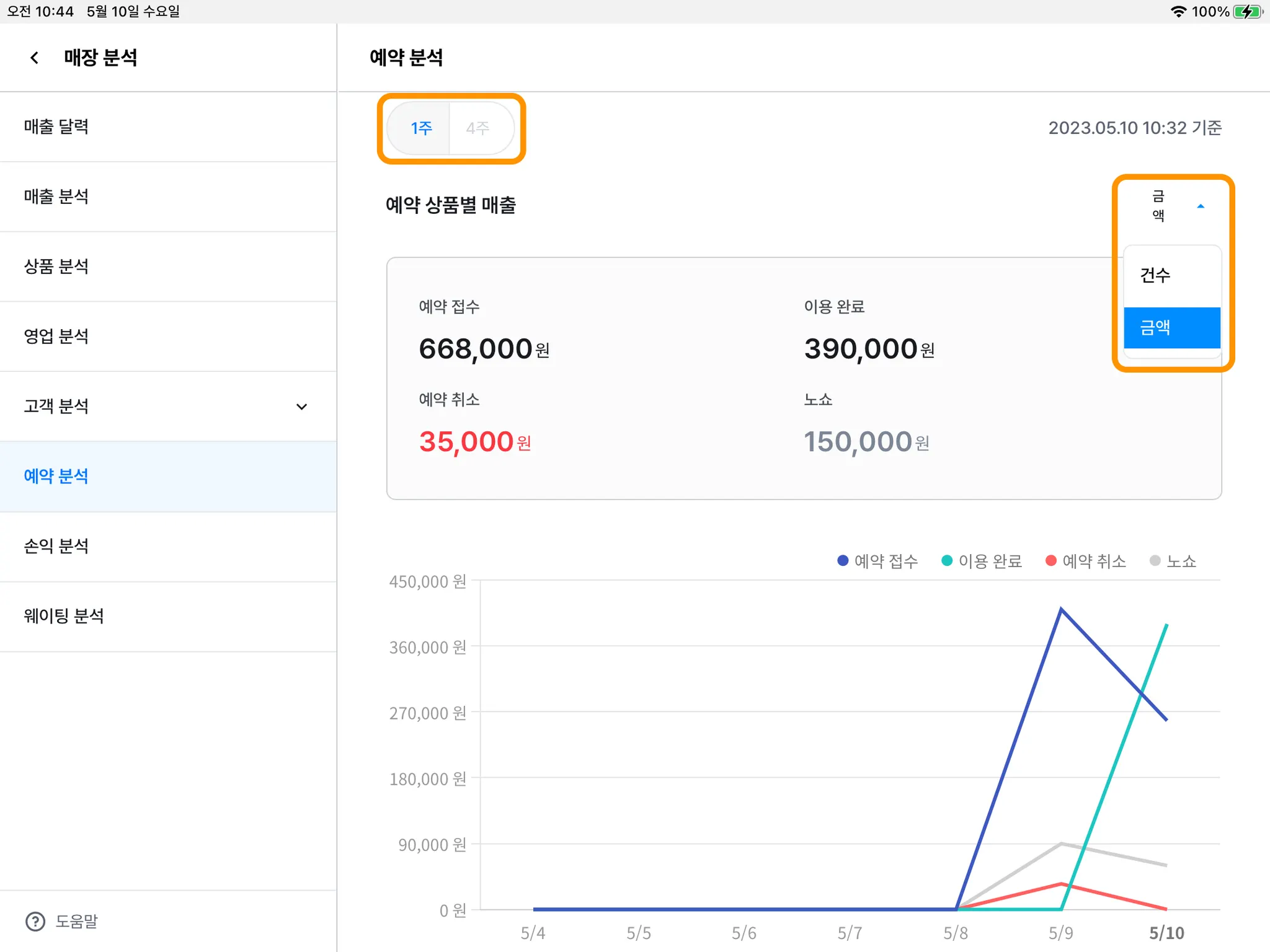 4) 기간(1주/4주)을 선택하고, 건수/금액별 현황도 나누어 볼 수 있습니다.