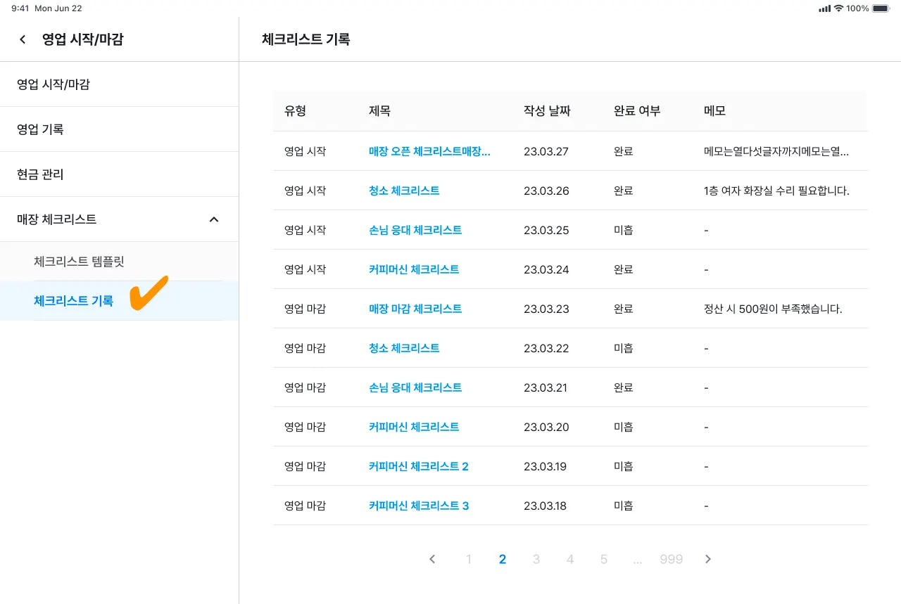 2) [매장 체크리스트] 메뉴에서 [체크리스트 기록]을 누르면 이전 체크리스트 기록을 확인할 수 있습니다.