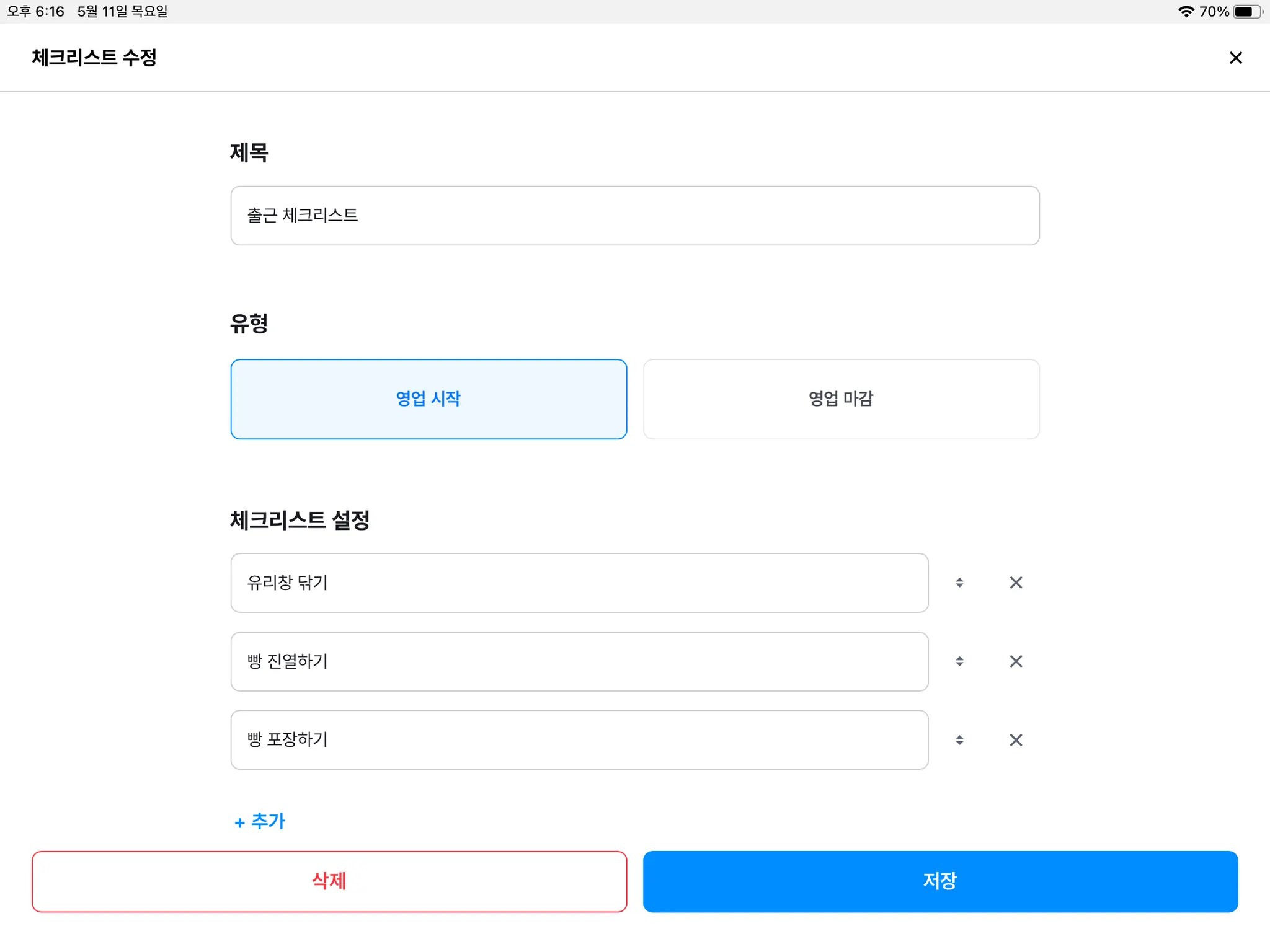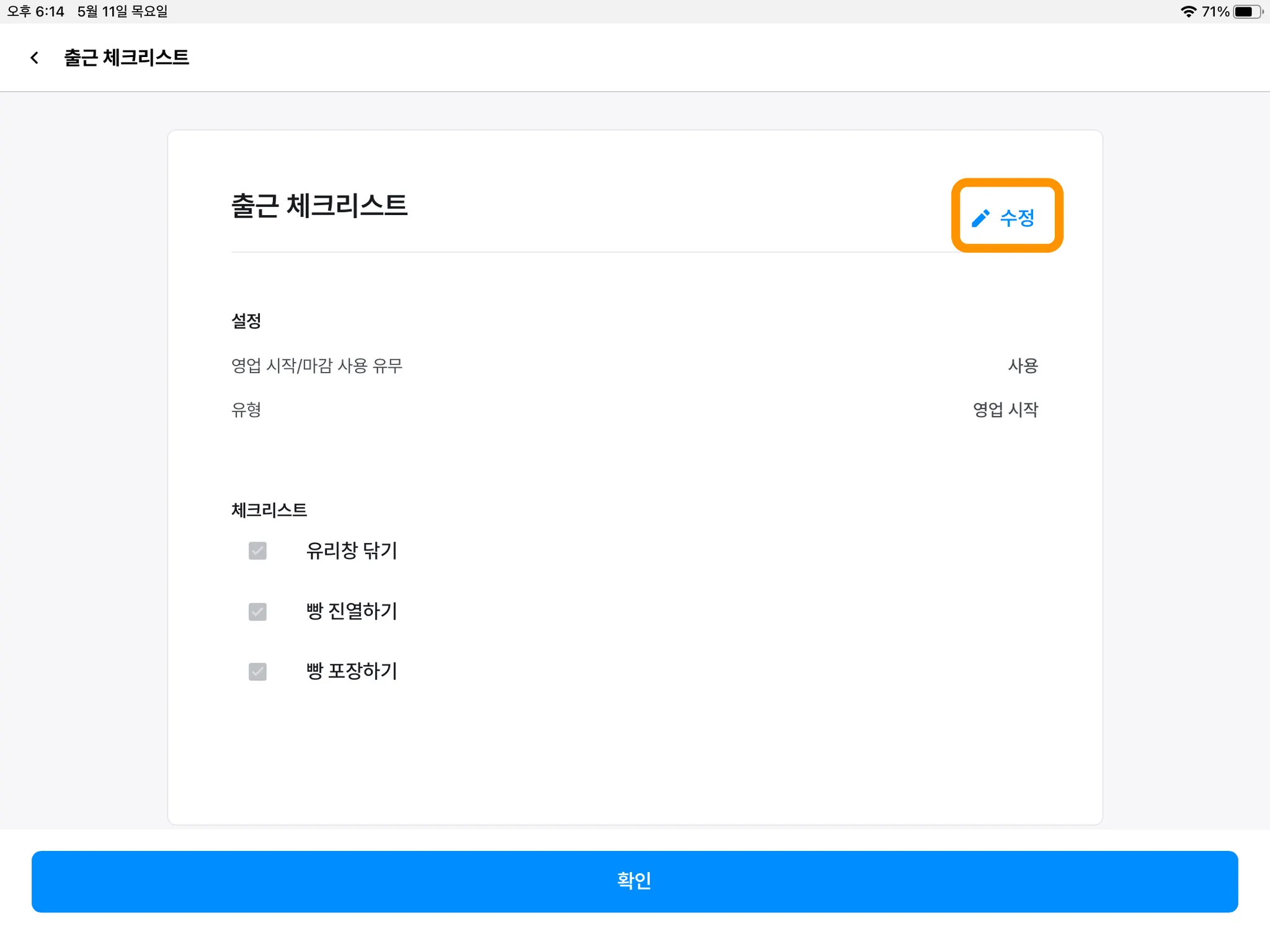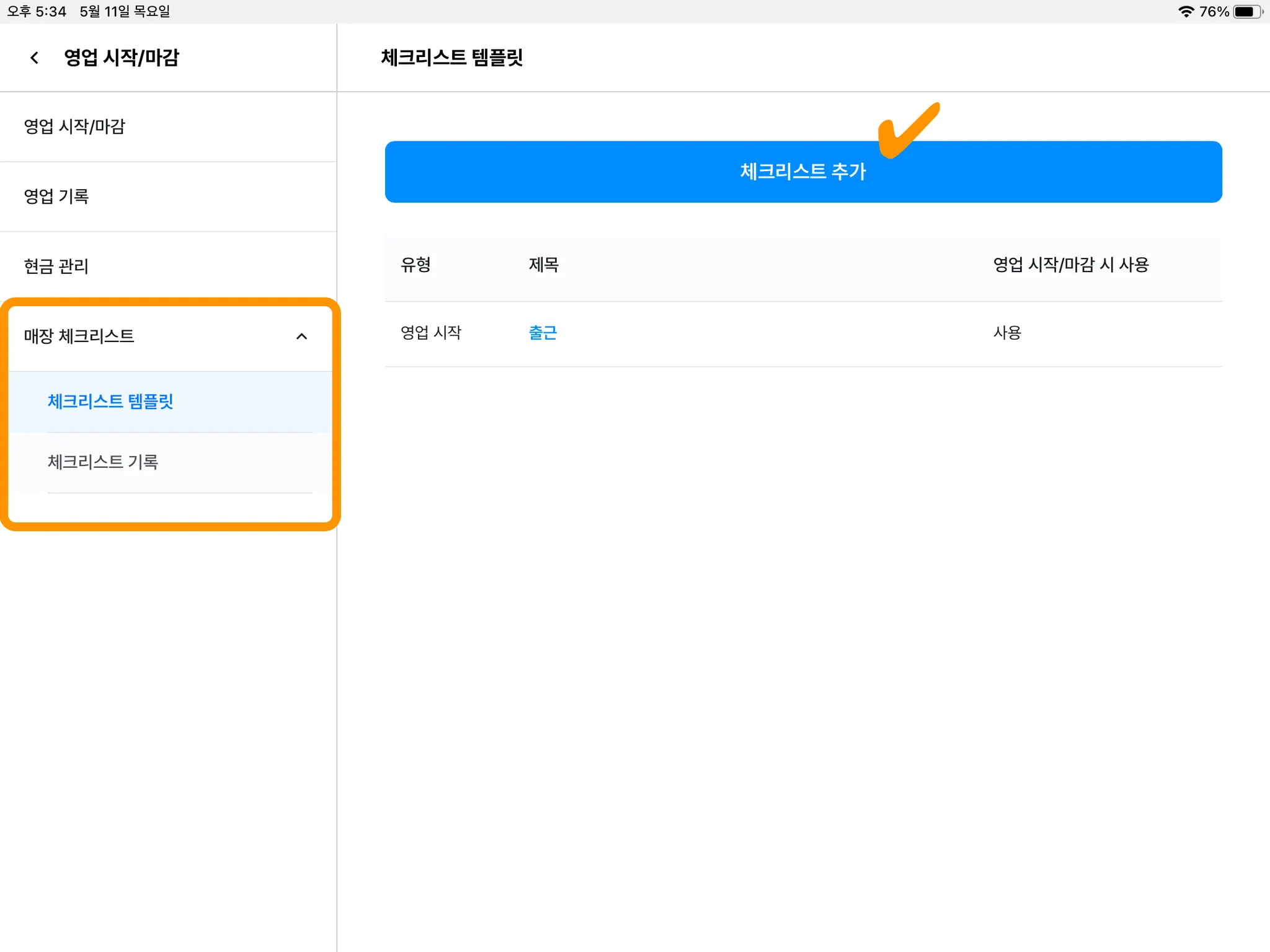 [영업 시작/마감 사용 유무] - 사용을 활성화하면 영업 시작과 마감시에 각각의 체크리스트가 보여집니다.