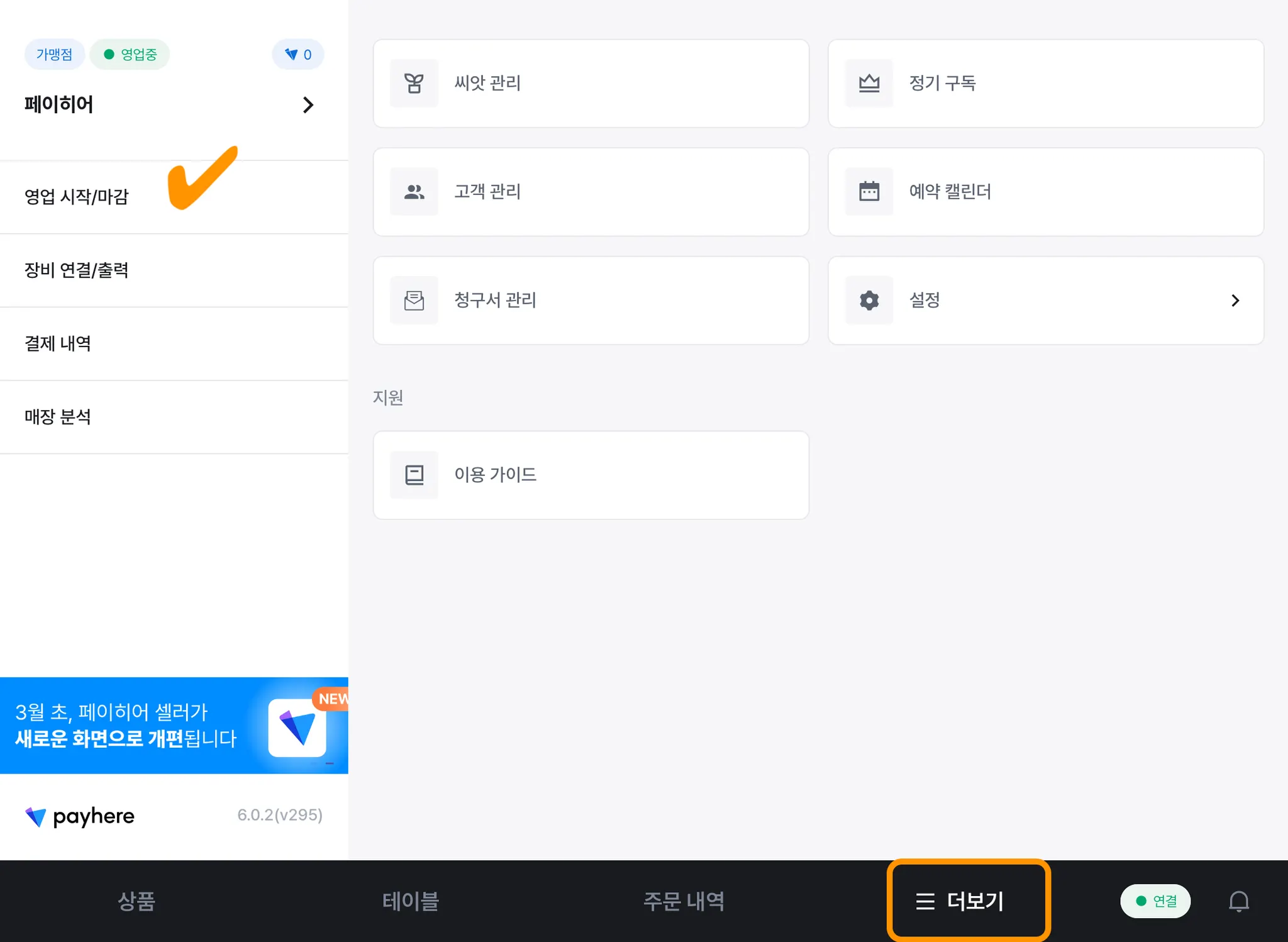 1) [더보기] 탭에서 [영업 시작/마감]을 선택해주세요.