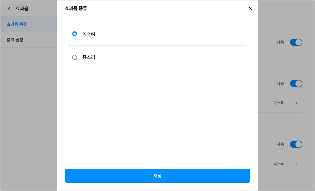 2) 효과음 종류 옆 [>]를 누르면 목소리와 종소리 중 선택할 수 있어요.