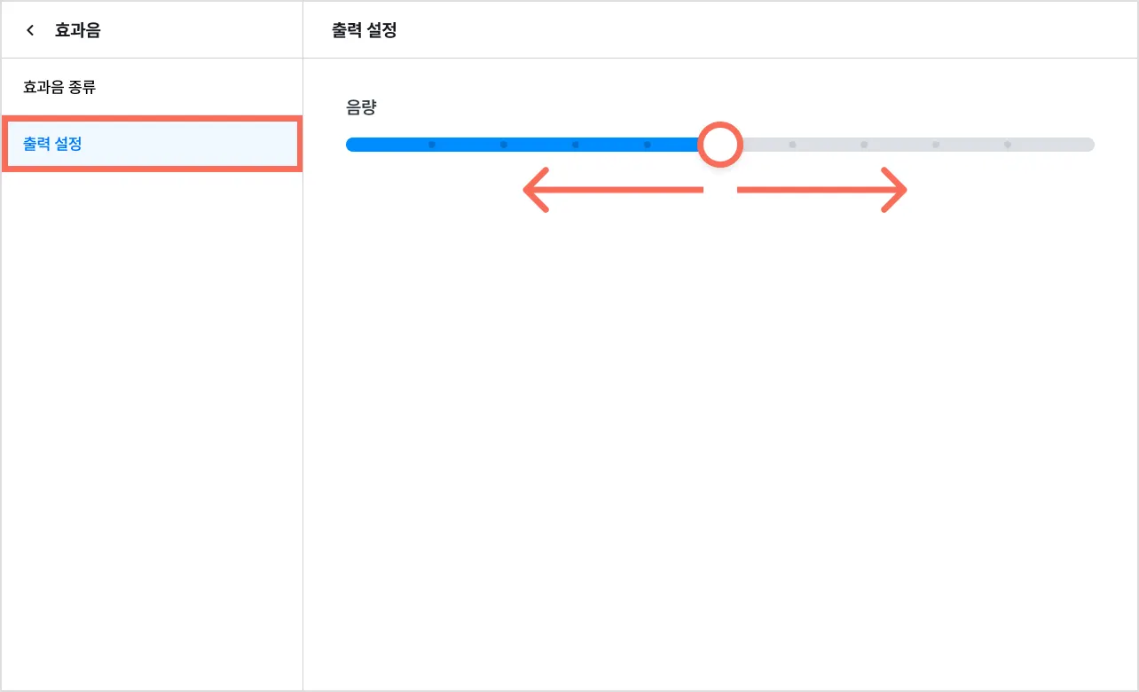 [출력 설정]을 누르면 설정한 효과음의 음량을 조절할 수 있어요.