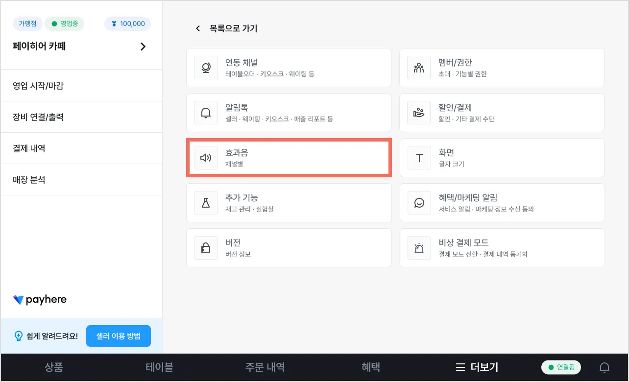 1) [효과음 종류]에서 결제 완료 효과음을 ‘사용’으로 설정해 주세요.