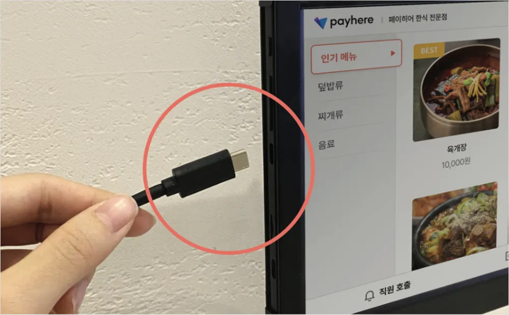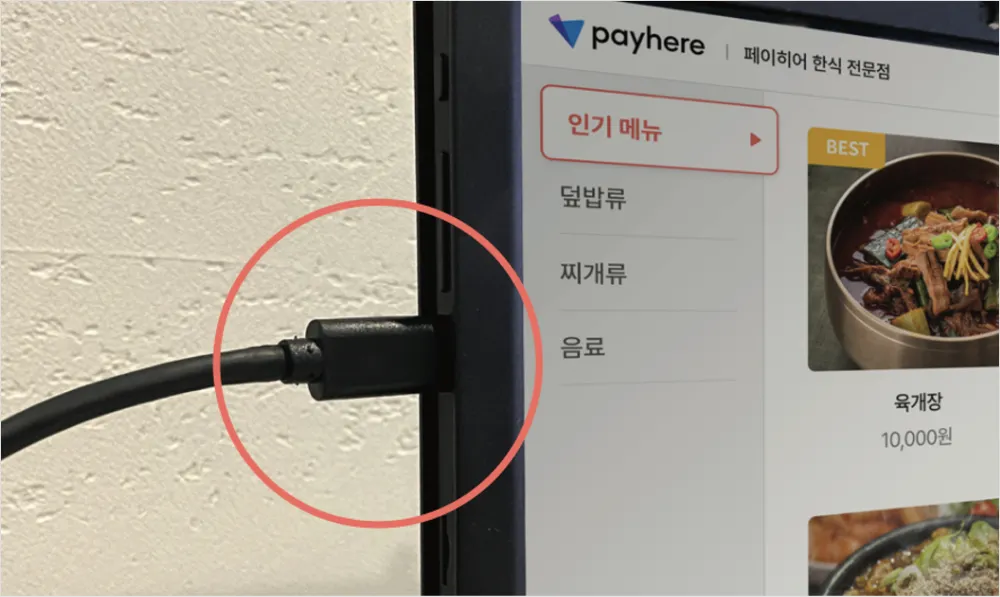 1) 태블릿 좌측 상단 포트에 연결돼 있는 카드 리더기 케이블을 빼 주세요.