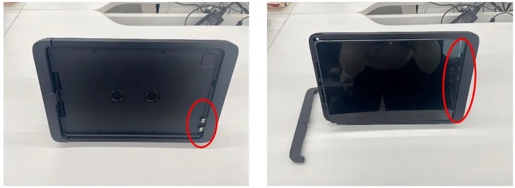 4) 왼쪽의 태블릿 커버를 분리한 다음 태블릿을 충전 단자에 끼워주세요.