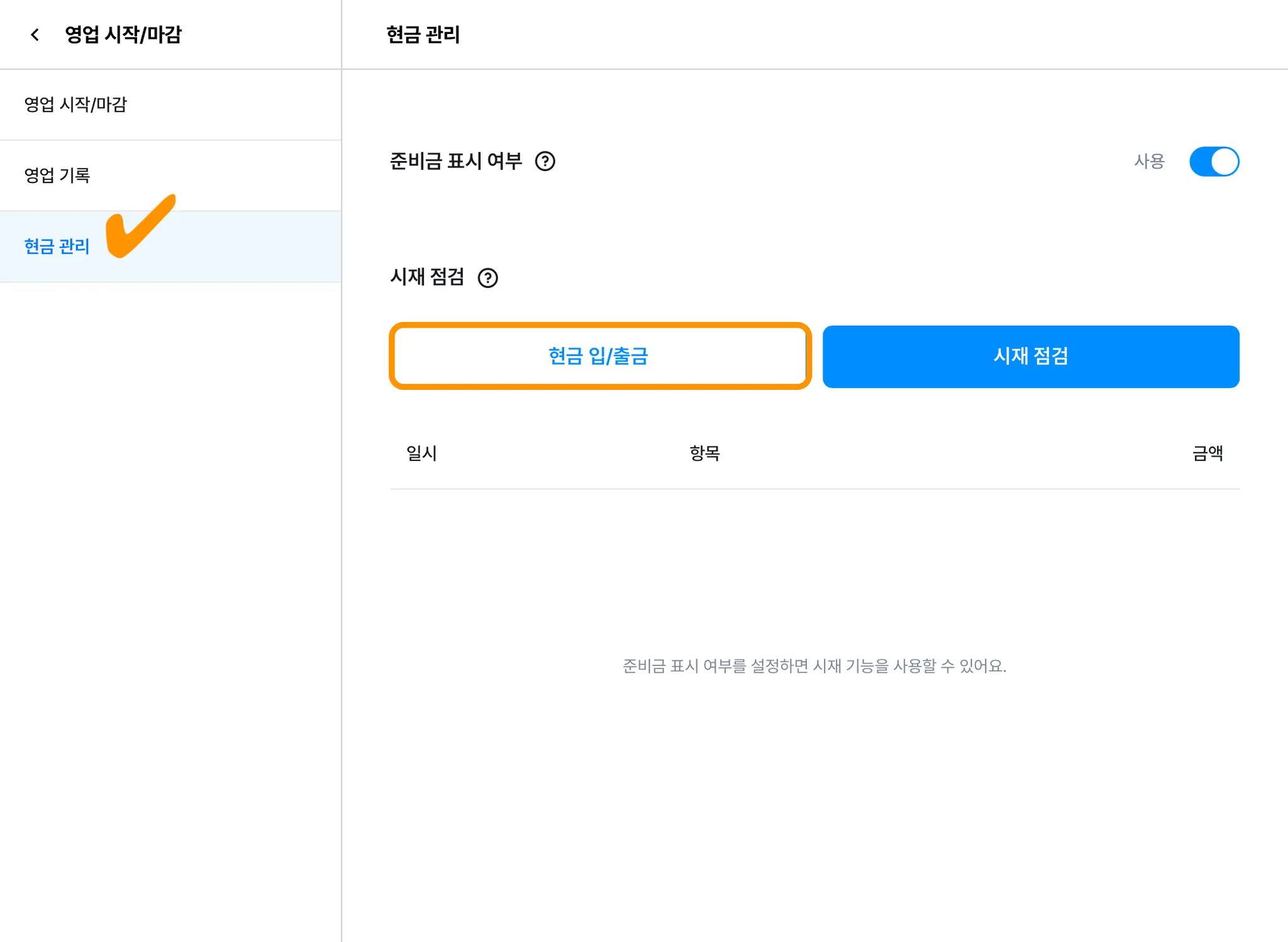 2) 현금 관리에서 [준비금 표시 여부] 버튼을 활성화해 주세요.