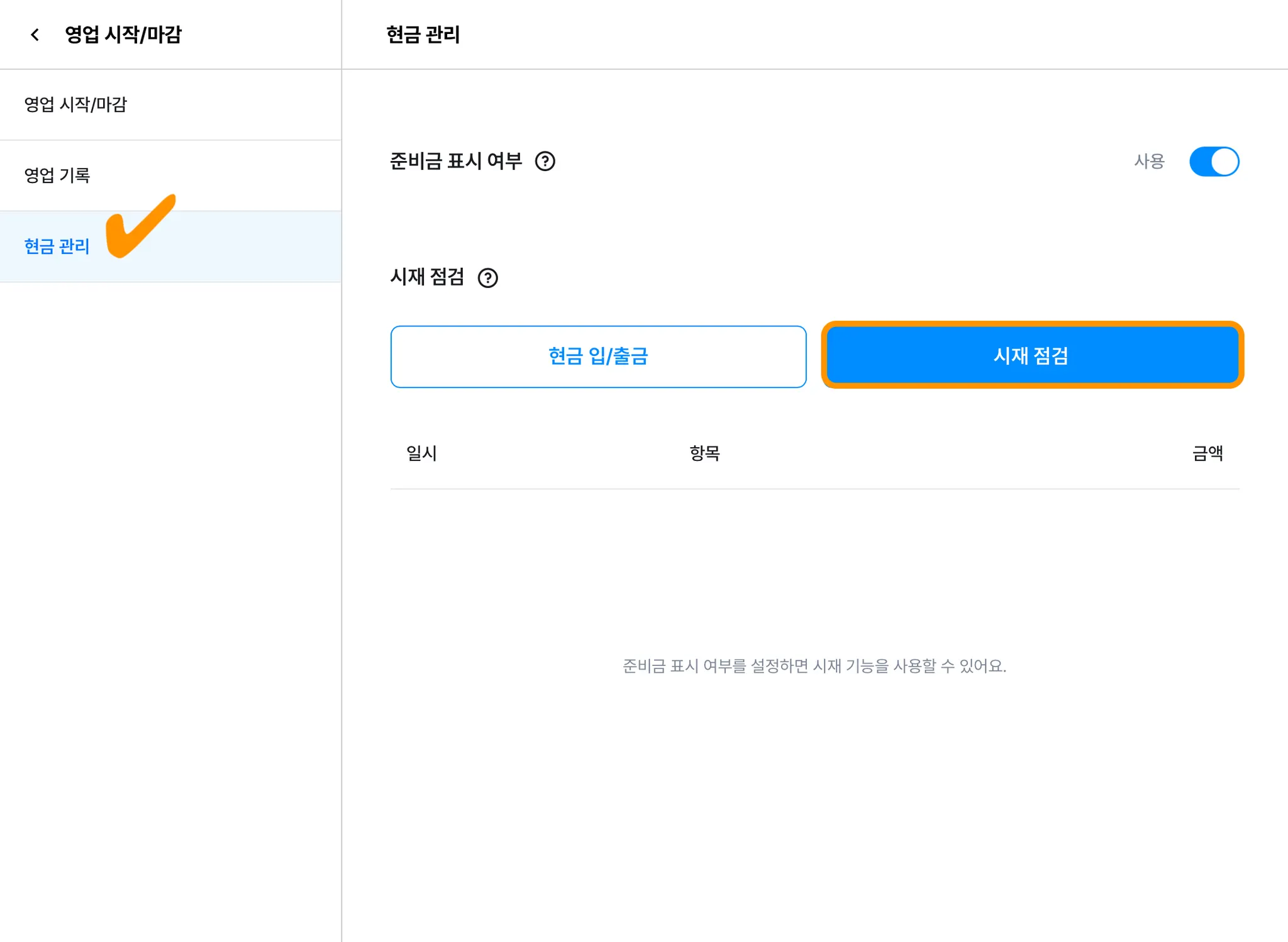 2) 현금 관리 → 시재 점검 항목에서 아래 [시재 점검] 버튼을 눌러주세요.