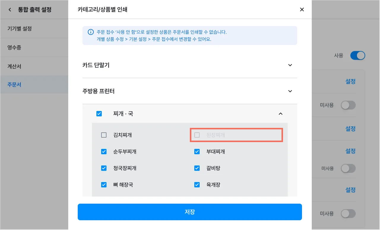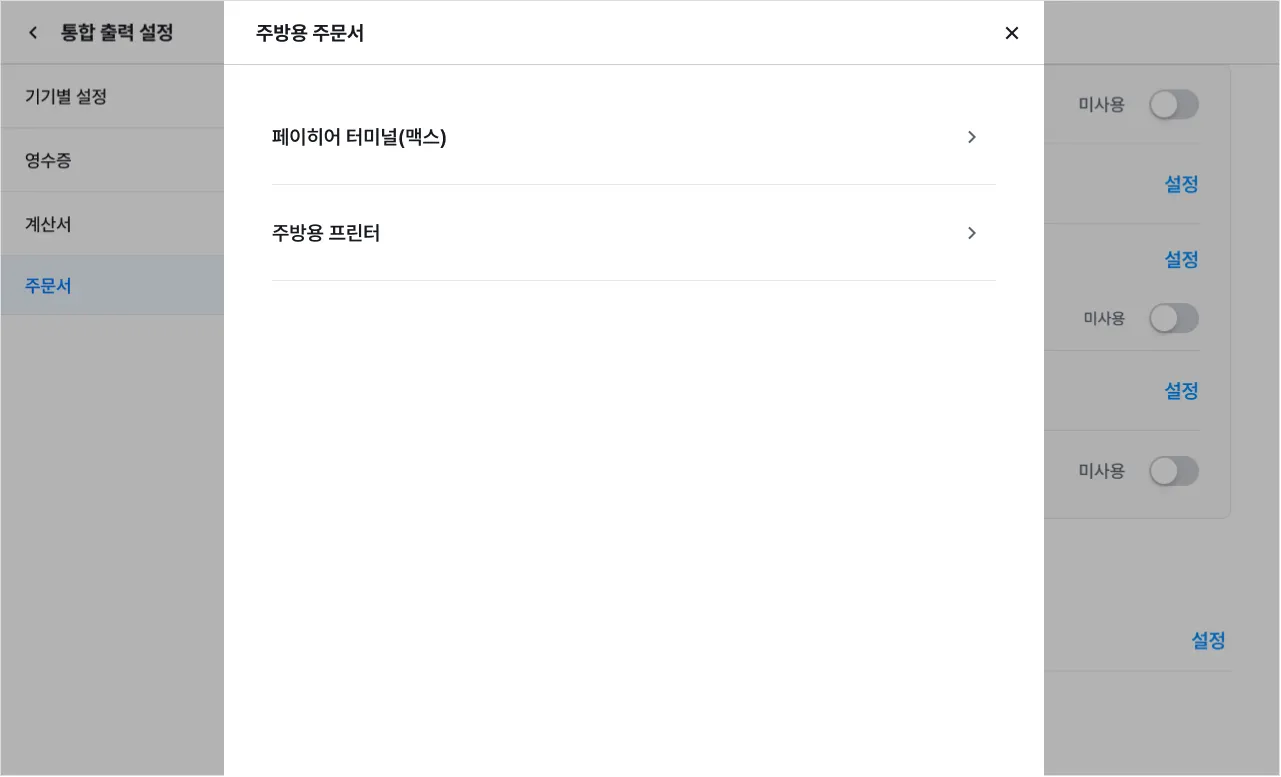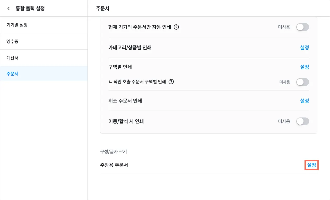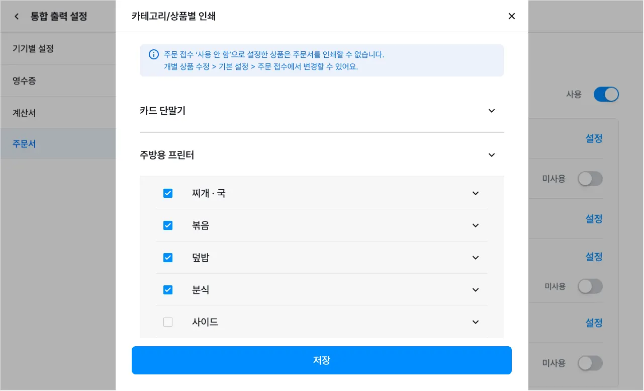 [설정]을 눌러 기기별로 주문서에 표시할 카테고리 및 상품을 선택할 수 있어요.