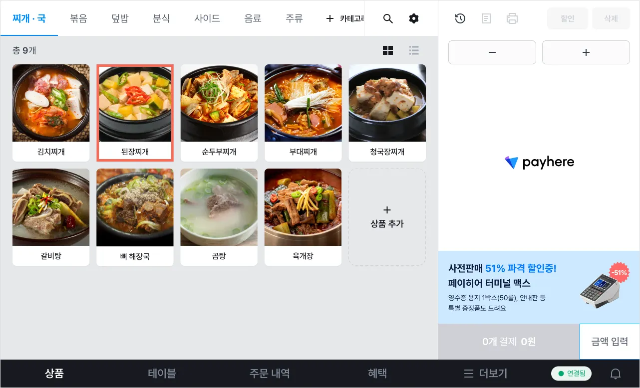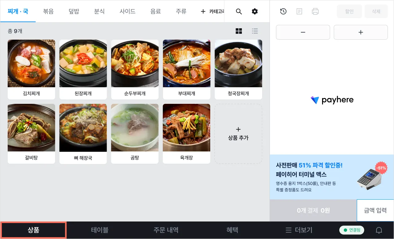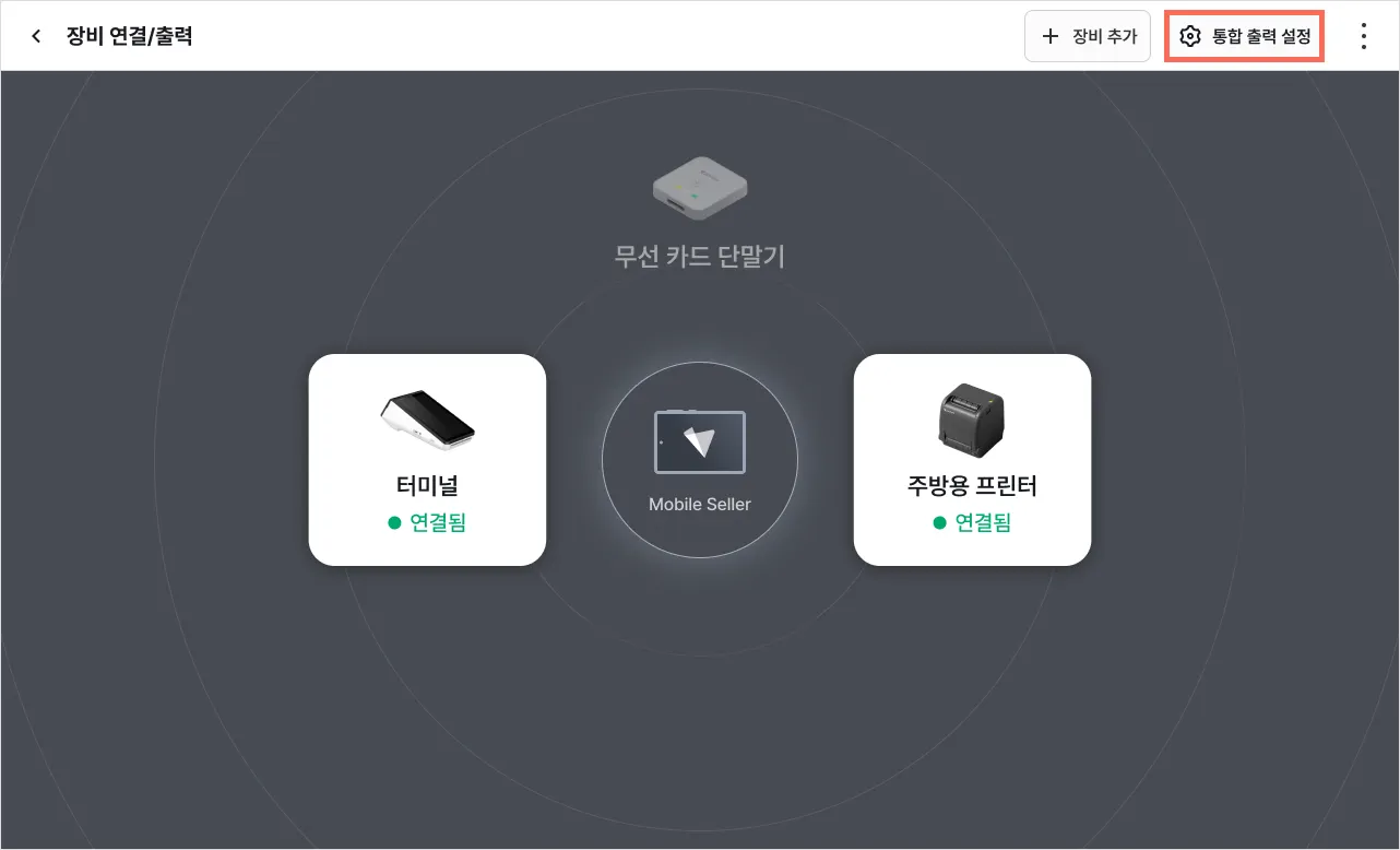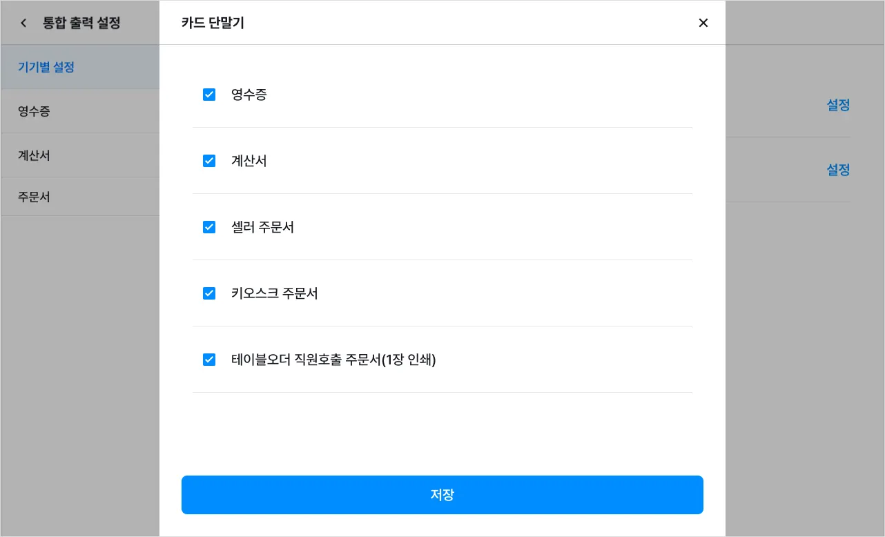 [설정]을 눌러 기기별로 주문서에 표시할 카테고리 및 상품을 선택할 수 있어요.