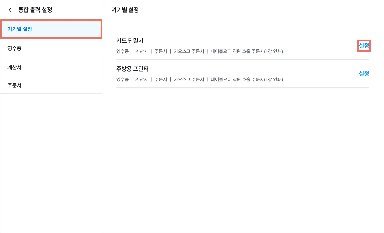 3) [기기별 설정]에서 주문서 인쇄가 필요한 기기 옆 [설정]을 눌러주세요.
