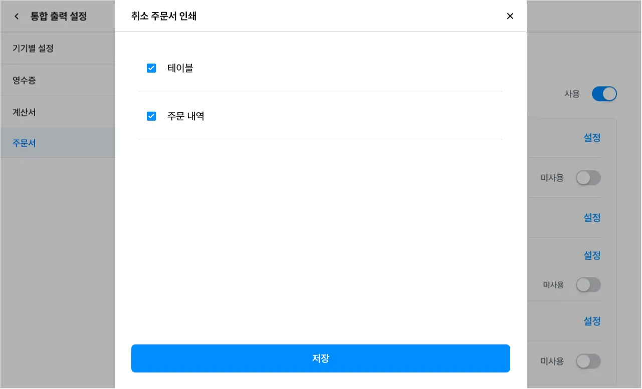 [설정]을 눌러 취소 주문서를 인쇄할 테이블 구역을 선택할 수 있어요.