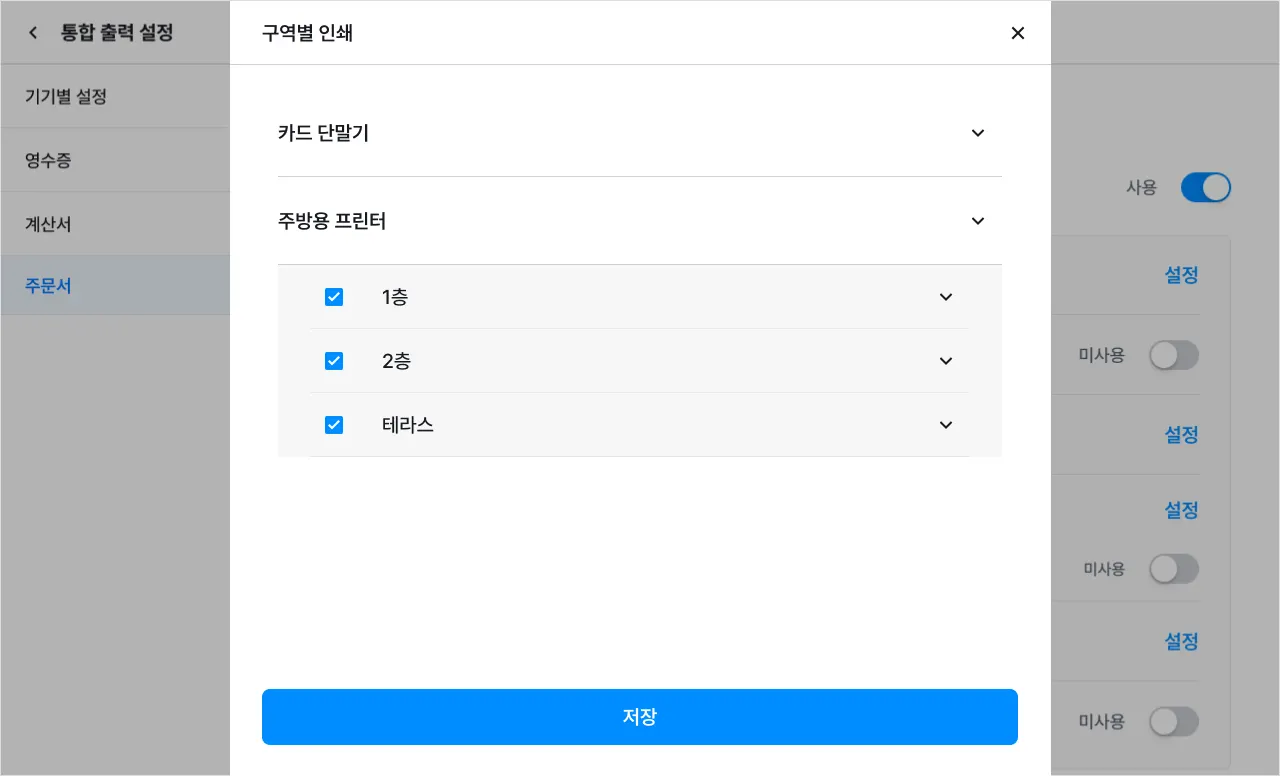 2) 직원 호출 주문서 구역별 인쇄를 ‘사용’으로 변경하면 설정한 구역별로 ‘직원 호출 주문서’ 인쇄가 가능해요.