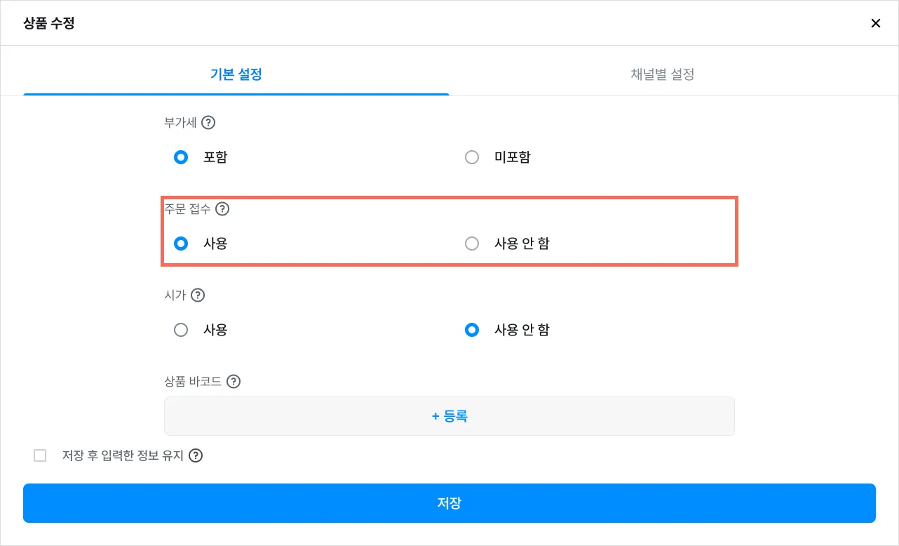 ④  주문 접수 ‘사용’ 설정 → [저장]