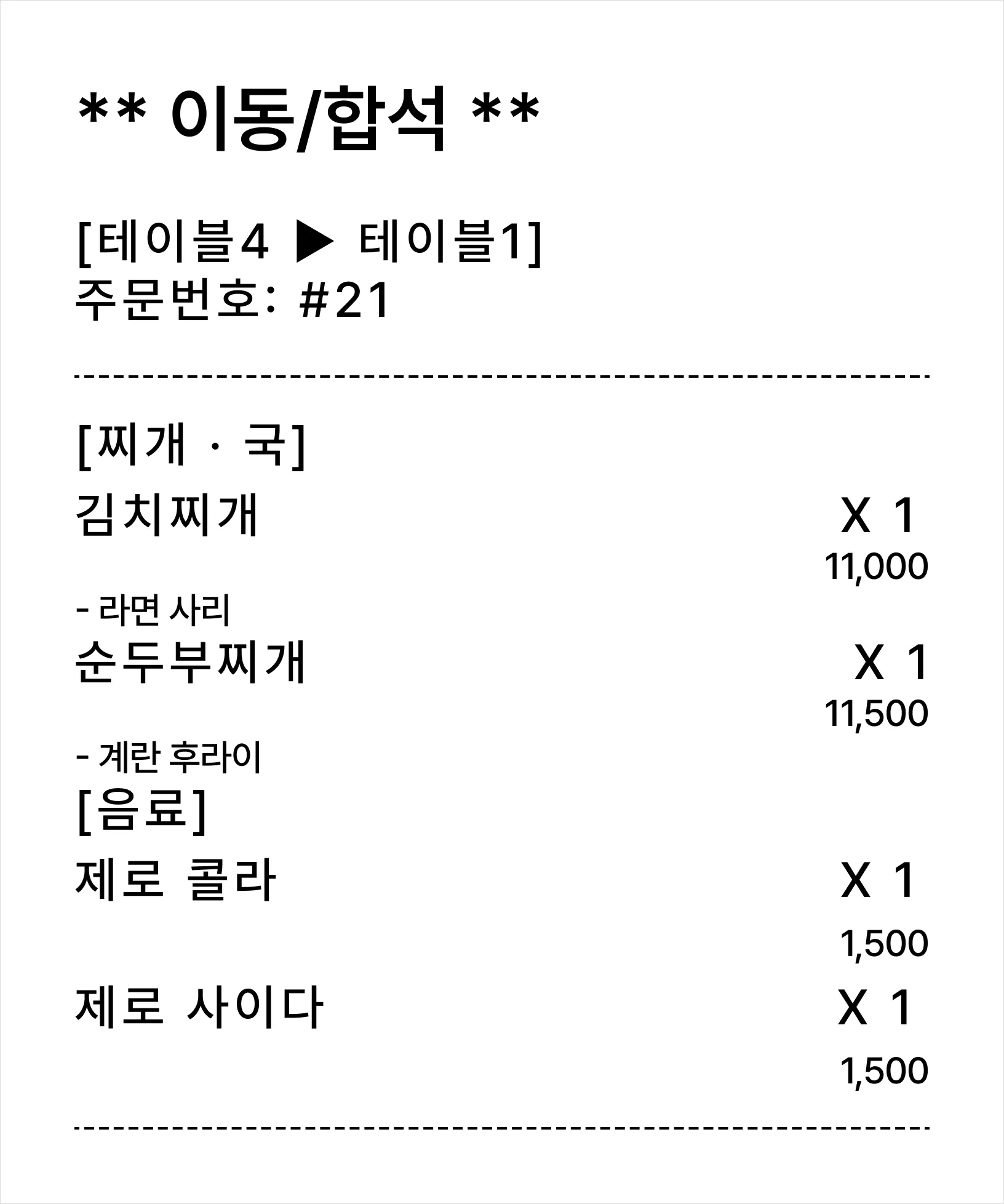 이동/합석 주문서 예시