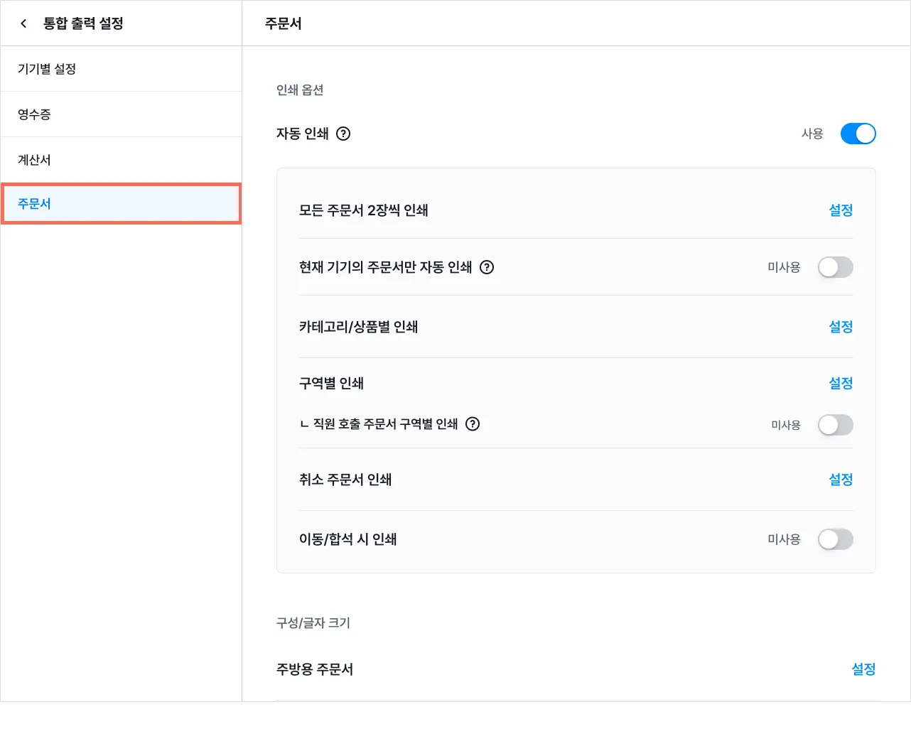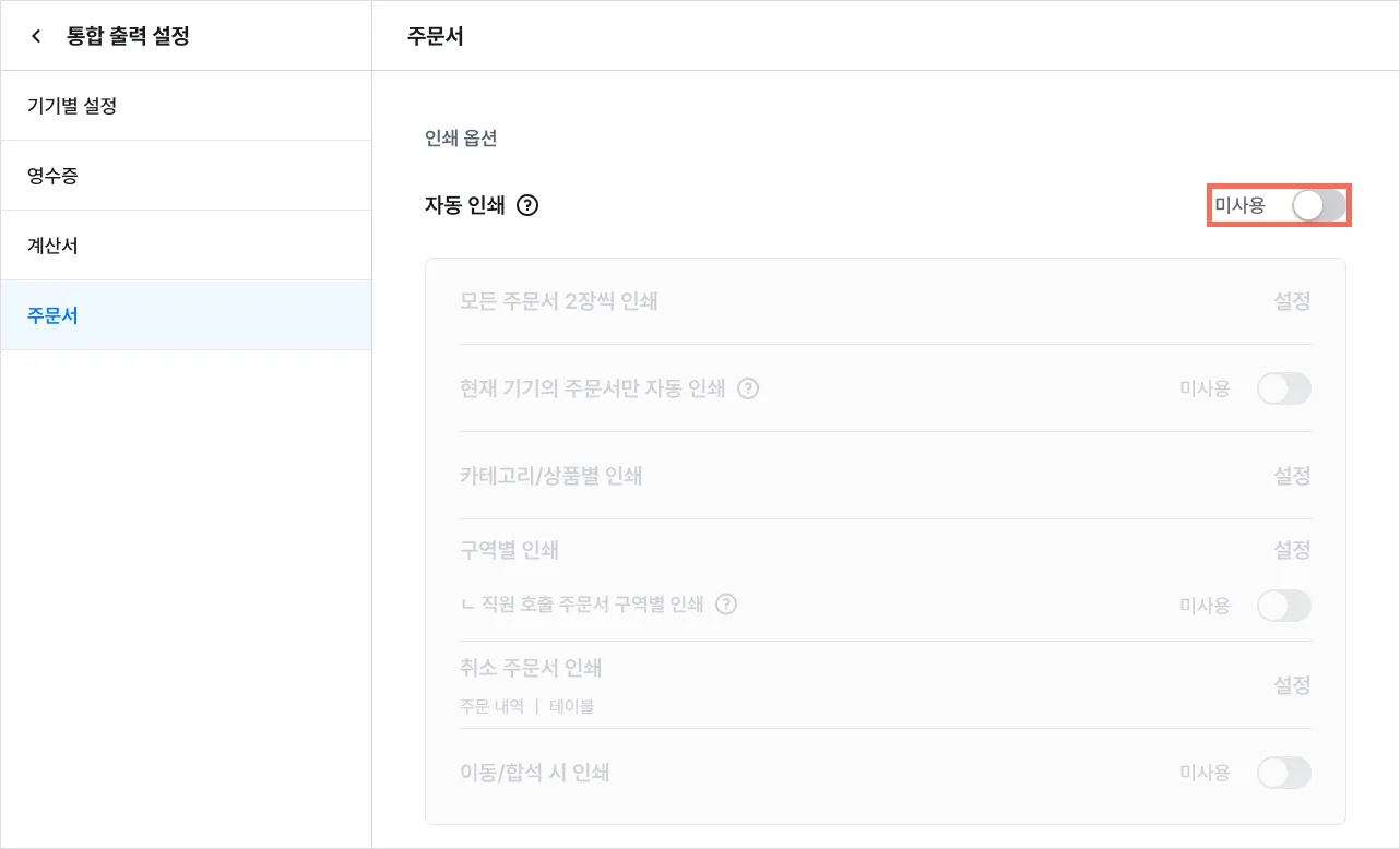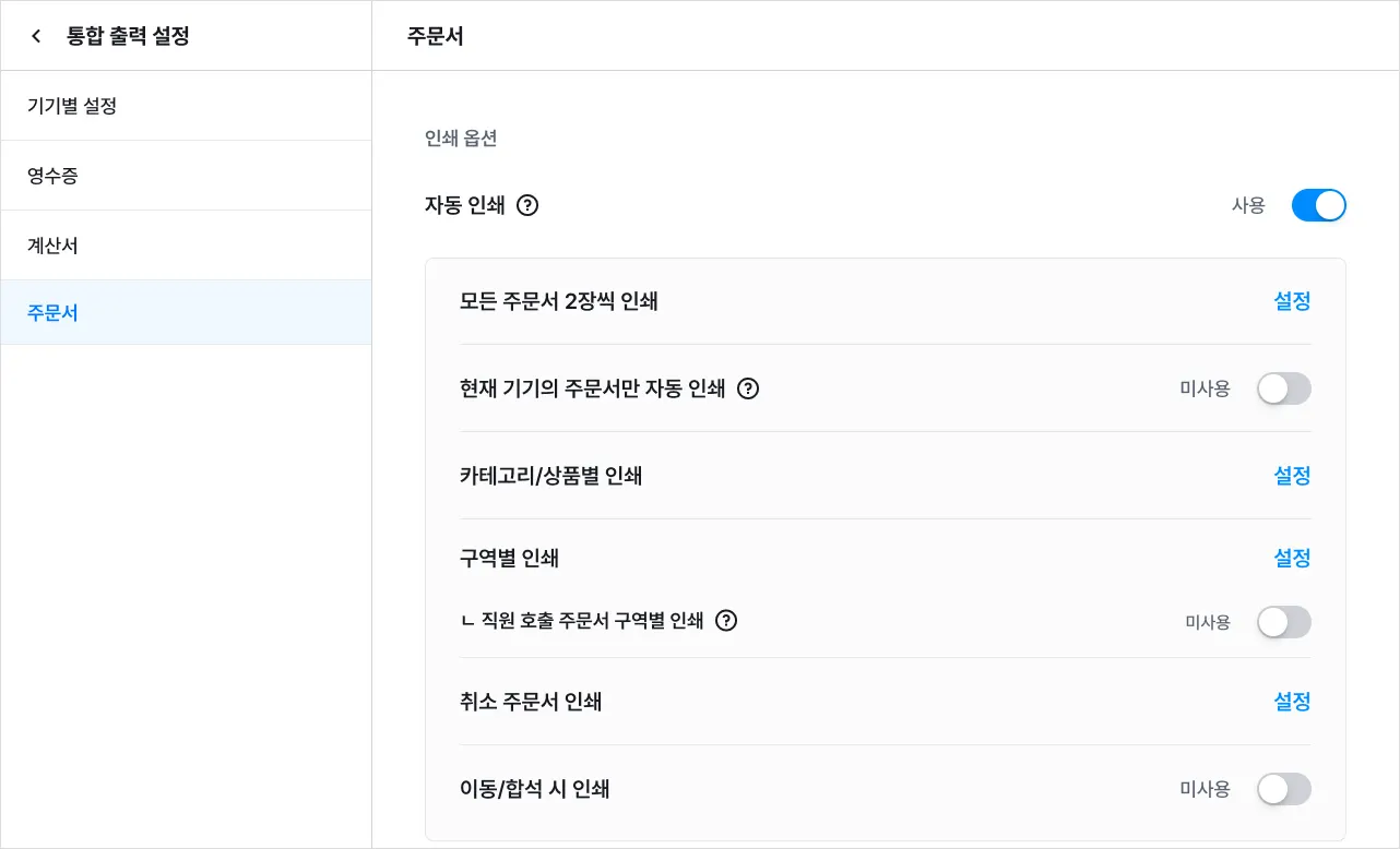 자동 인쇄를 ‘사용’으로 설정하면 연결된 기기에서 주문서가 자동 인쇄돼요.
