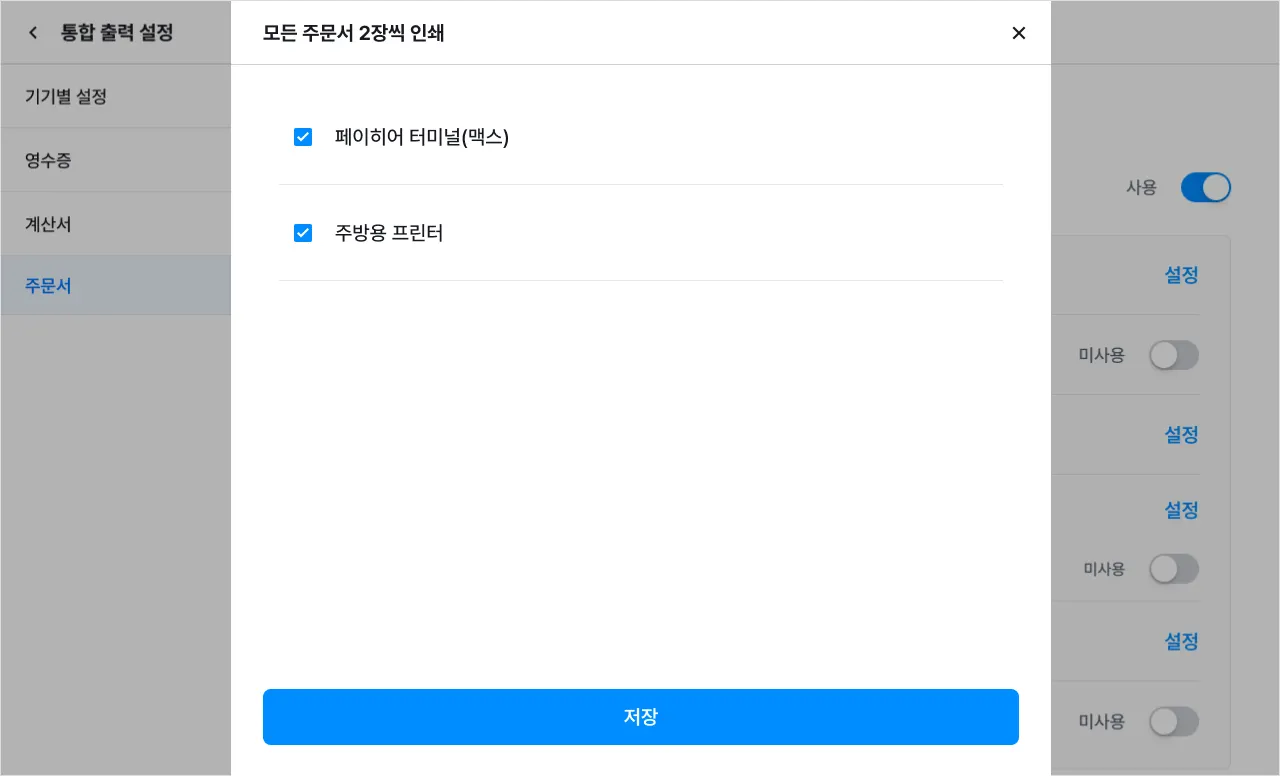 [설정]을 눌러 주문서를 2장씩 인쇄해야 하는 기기를 선택할 수 있어요.