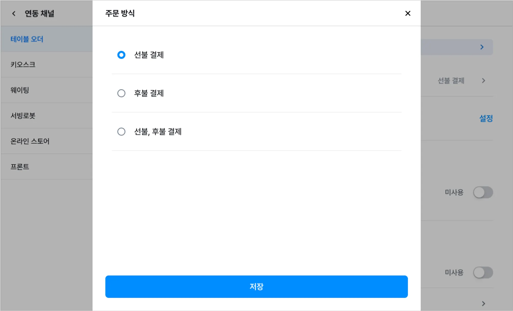 4) 주문 방식을 선택한 후 [저장]을 눌러주세요.