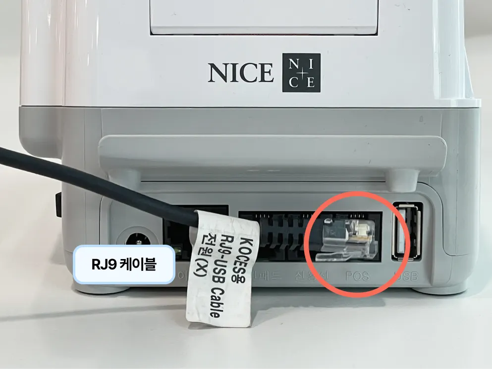 예시 사진과 같이 RJ9 케이블을 단말기와 PC에 꼭 ‘직접 연결’해 주세요.