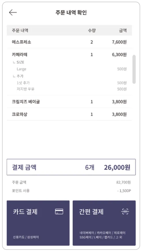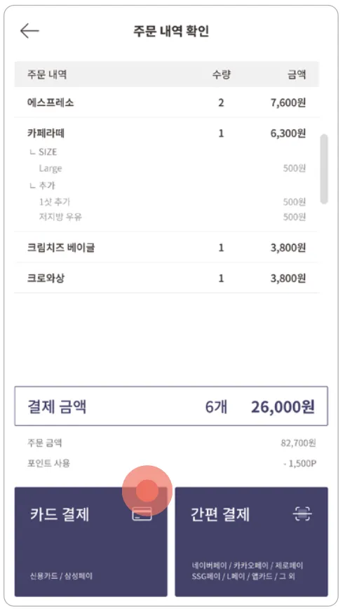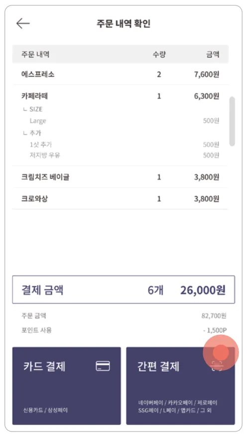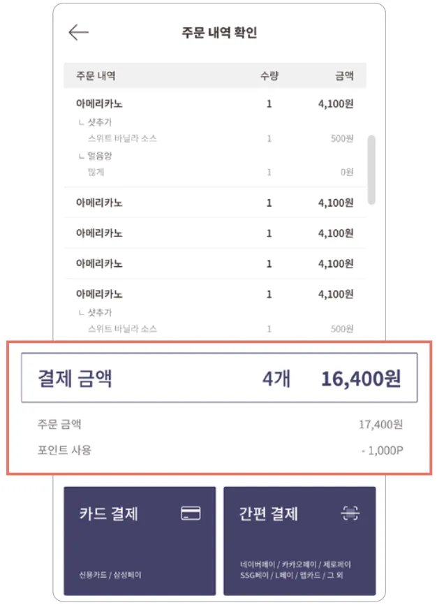 5) [결제] 버튼을 누른고 주문 내역을 확인한 뒤 결제 방법을 선택합니다.