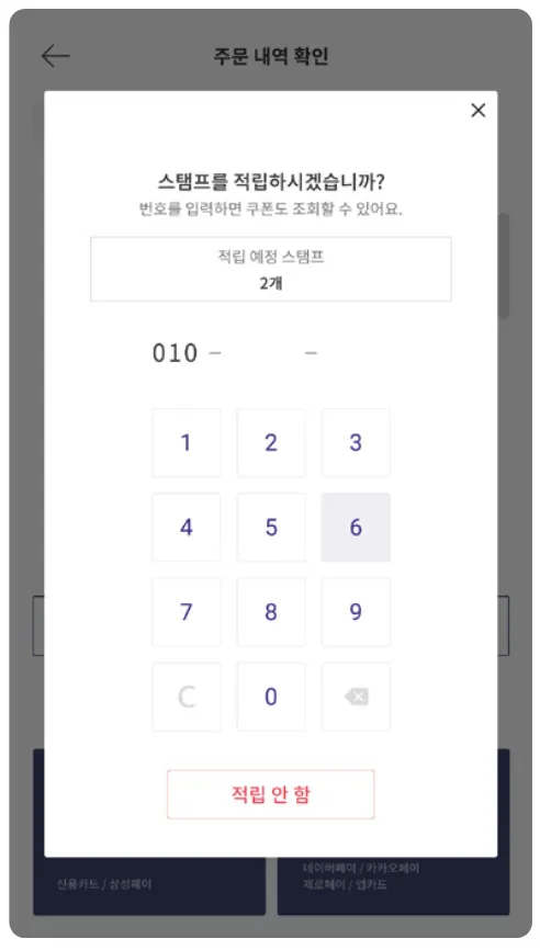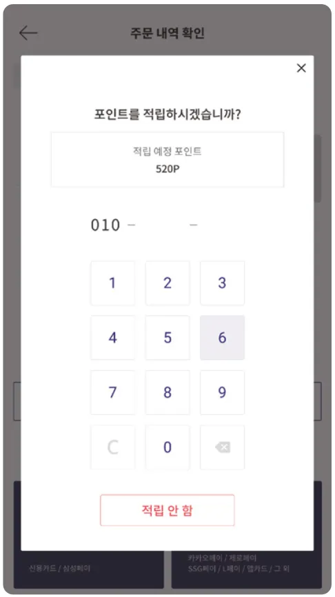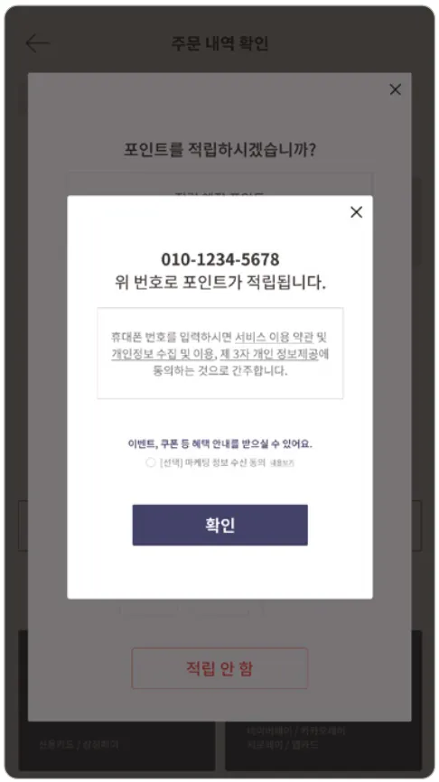 1) 포인트 적립 및 사용을 위한 핸드폰 번호를 입력합니다.