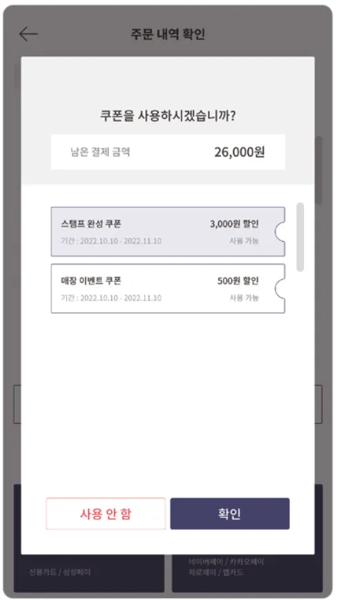 2) 스탬프 보상으로 받은 쿠폰이 있다면 선택하여 사용할 수 있습니다.