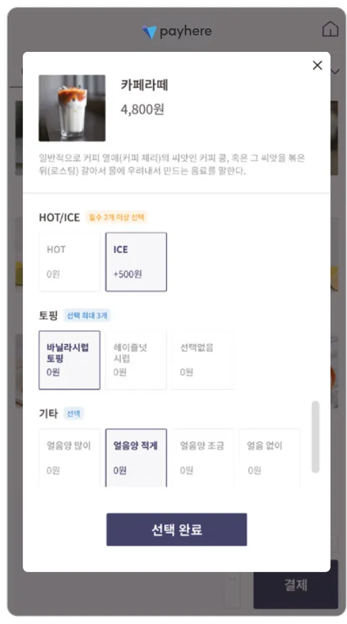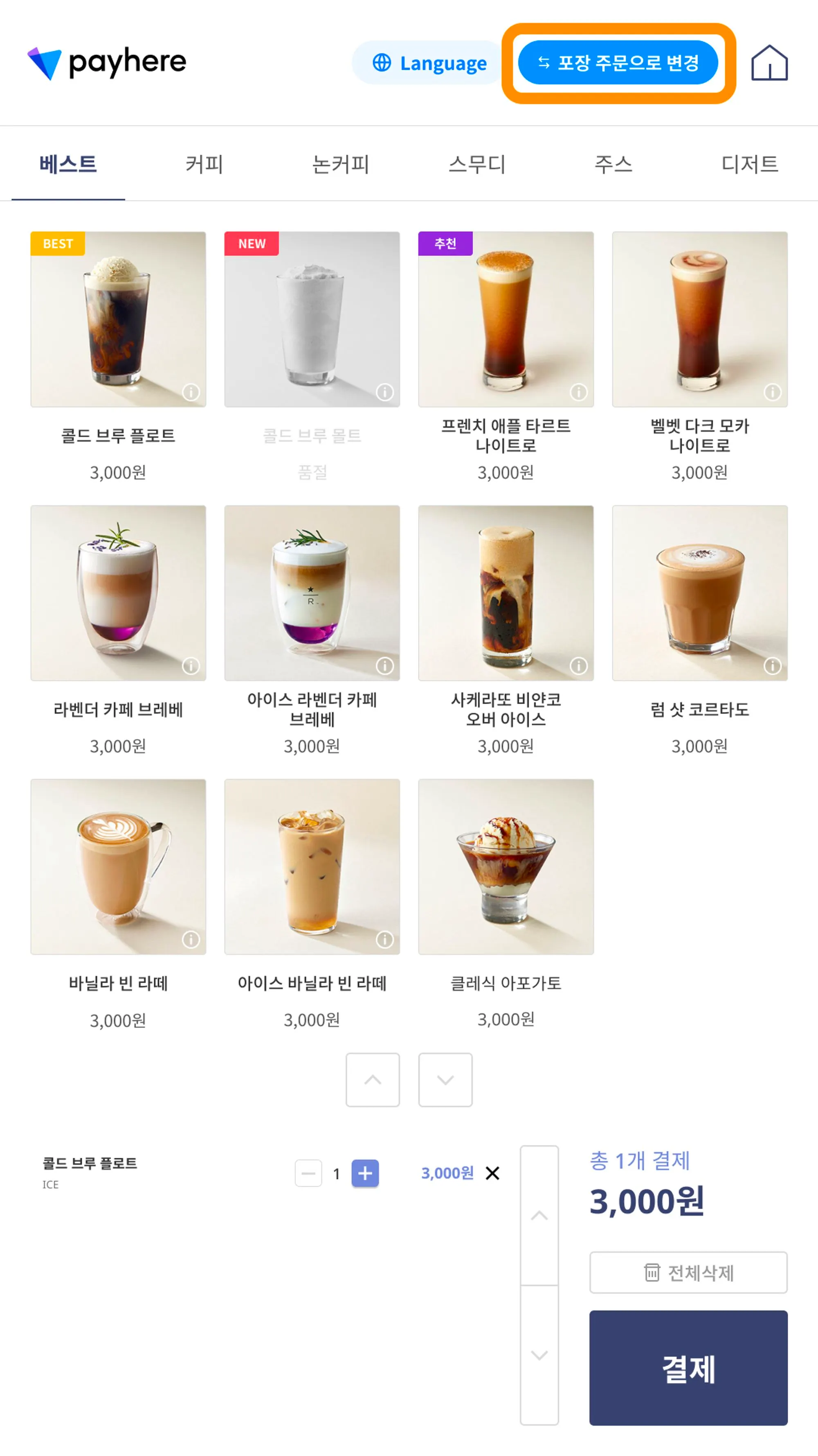 1) 매장/포장 여부를 선택합니다. (옵션)