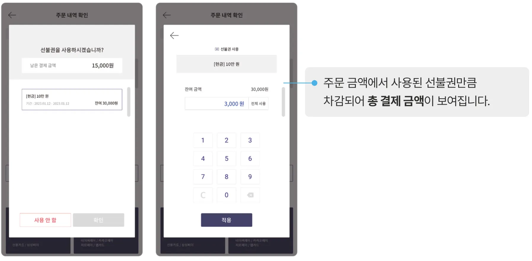 쿠폰 → 선불권 → 포인트 순서로 이용할 수 있습니다.